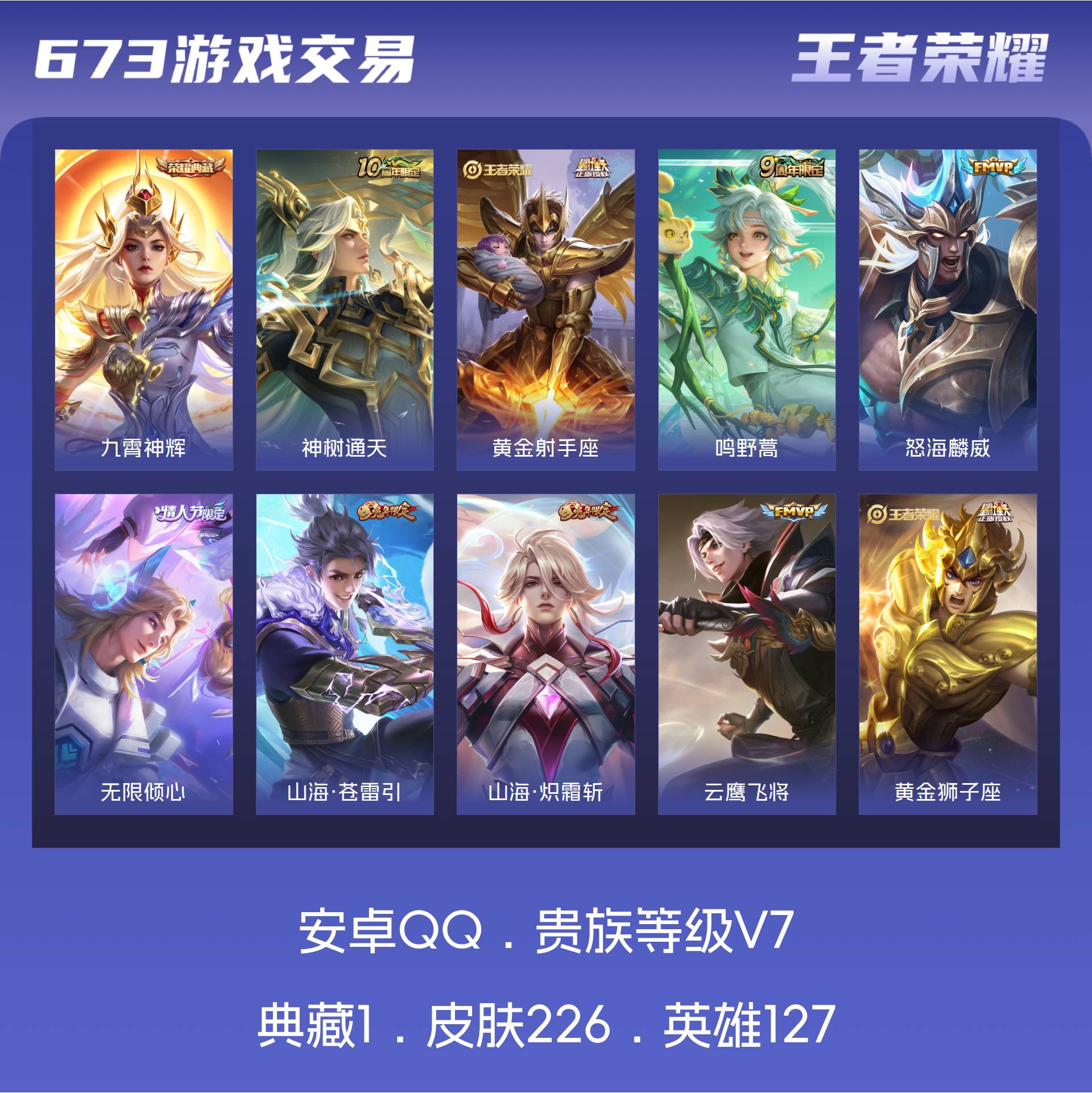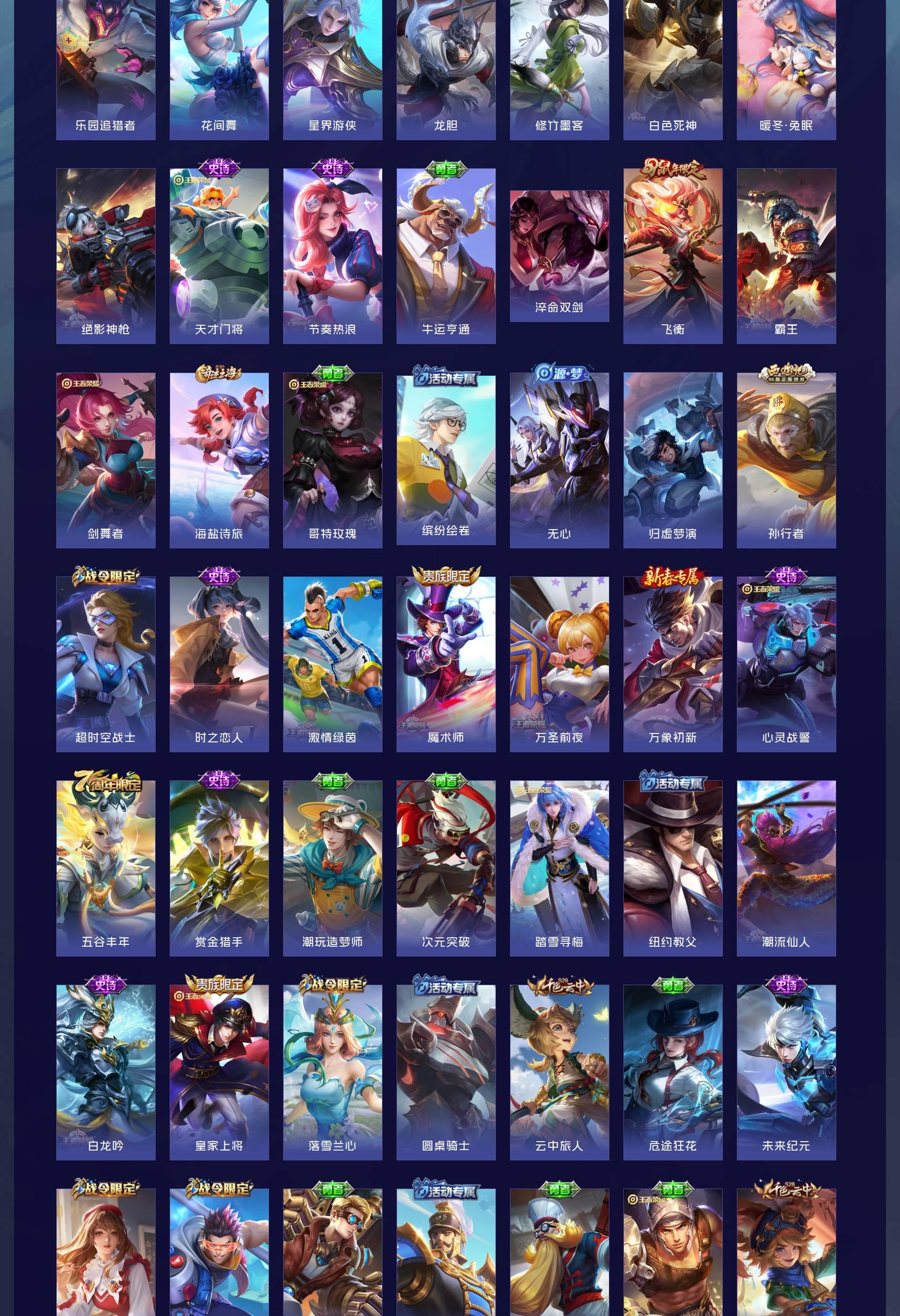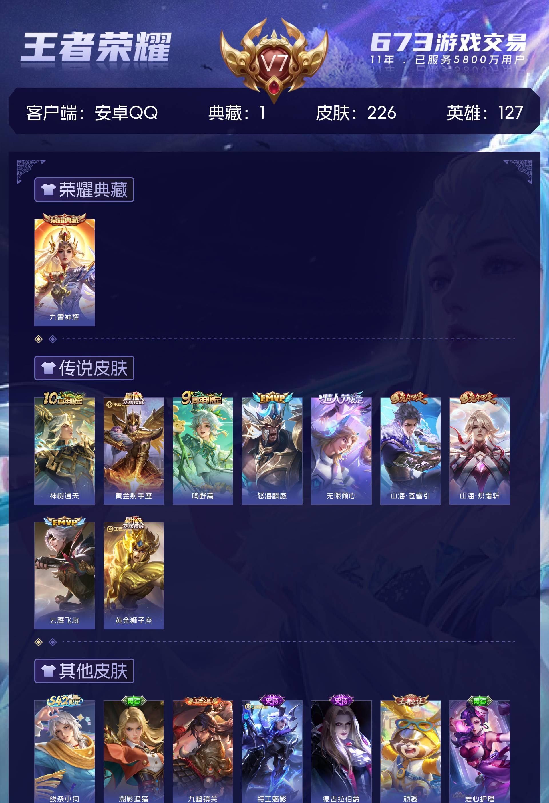 V7 皮肤226 英雄127 至尊星耀 荣耀典藏1 传说9 其他皮肤221