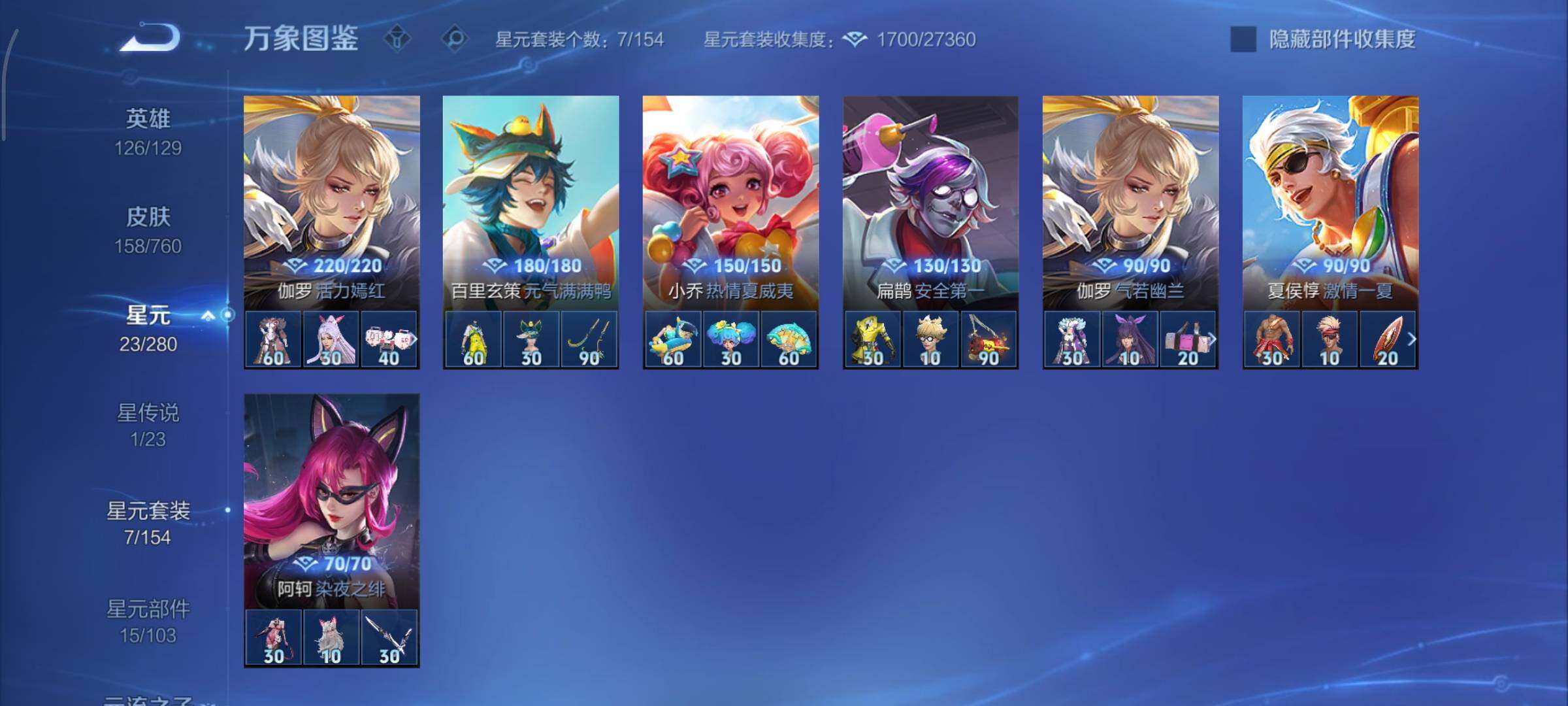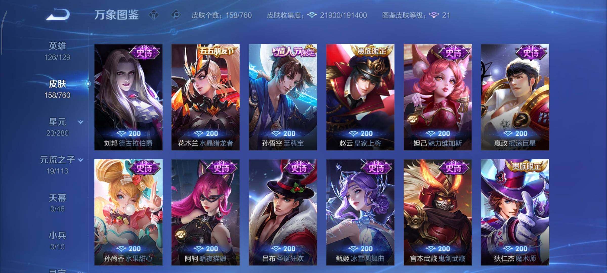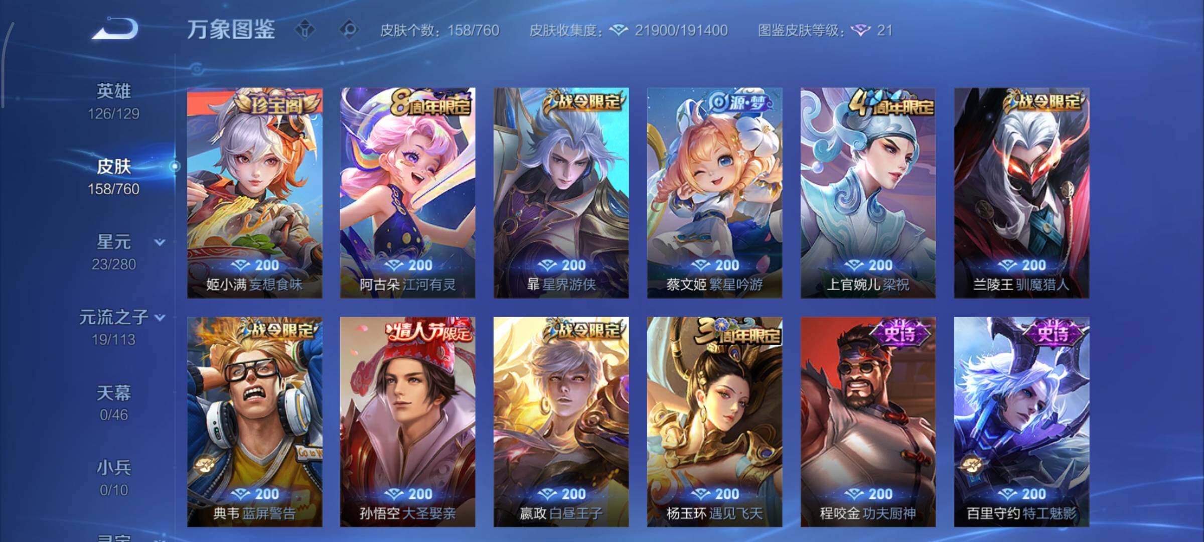 可换绑【捡漏号 貂蝉典藏 嫦娥孙策珍品 蛇年限定 多传说限定号】3按键,1星传说,2王者印记,五级铭文170,可二次KK7832,安卓Q-V7-158皮肤-1典藏皮肤-2珍品传说-6传说-36史诗【英雄全皮】:空空儿全皮【荣耀典藏】:貂蝉幻阙歌【珍品传说】:孙策时之奇旅,嫦娥器灵落星盏【星元皮肤】:貂蝉金色仲夏夜【传说皮肤】:澜愿照九州拓,吕布怒海麟威,王昭君乞巧织