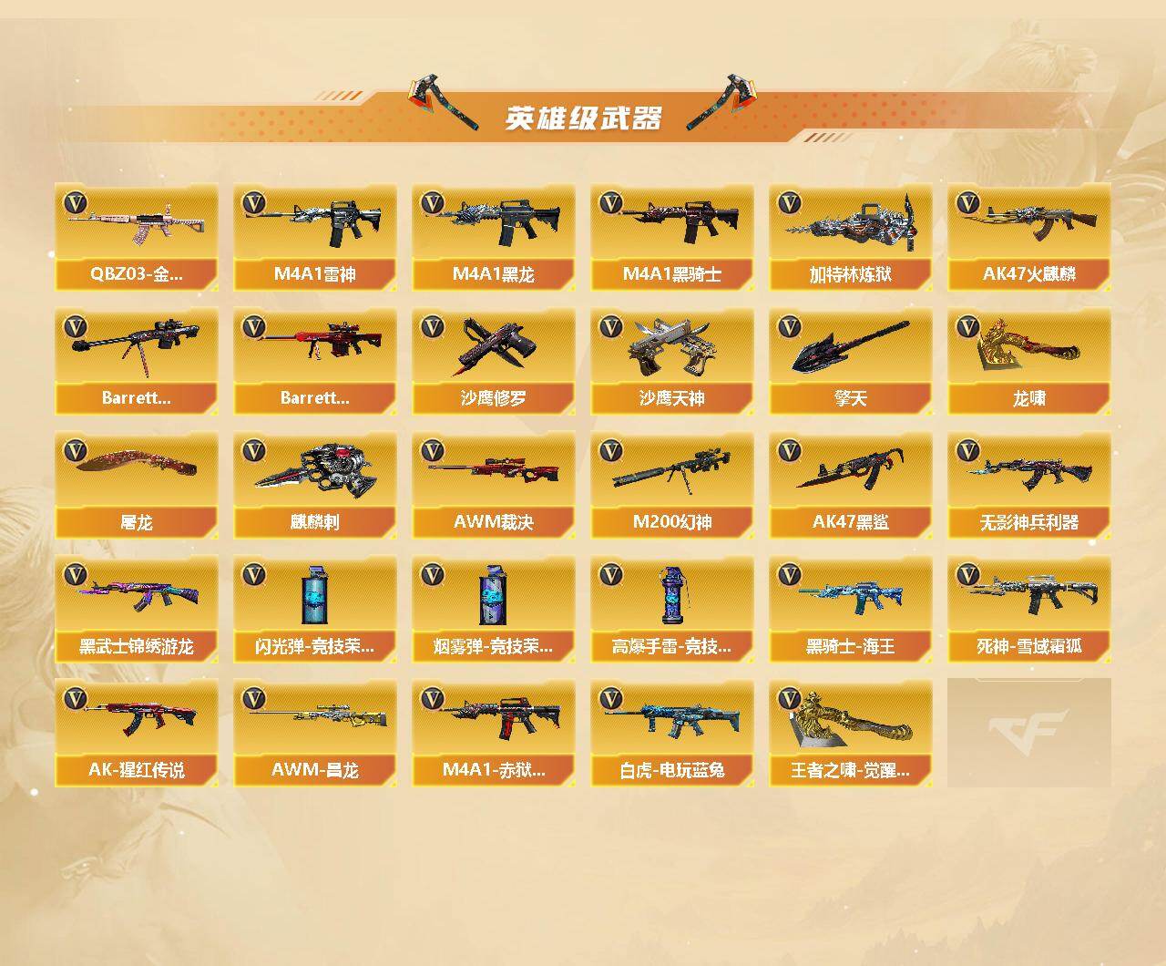 【热门武器】:QBZ03-金色蔷薇*2,M200-幻神,白虎-电玩蓝兔,M4A1-黑骑士,加特林-炼狱,沙鹰-修罗