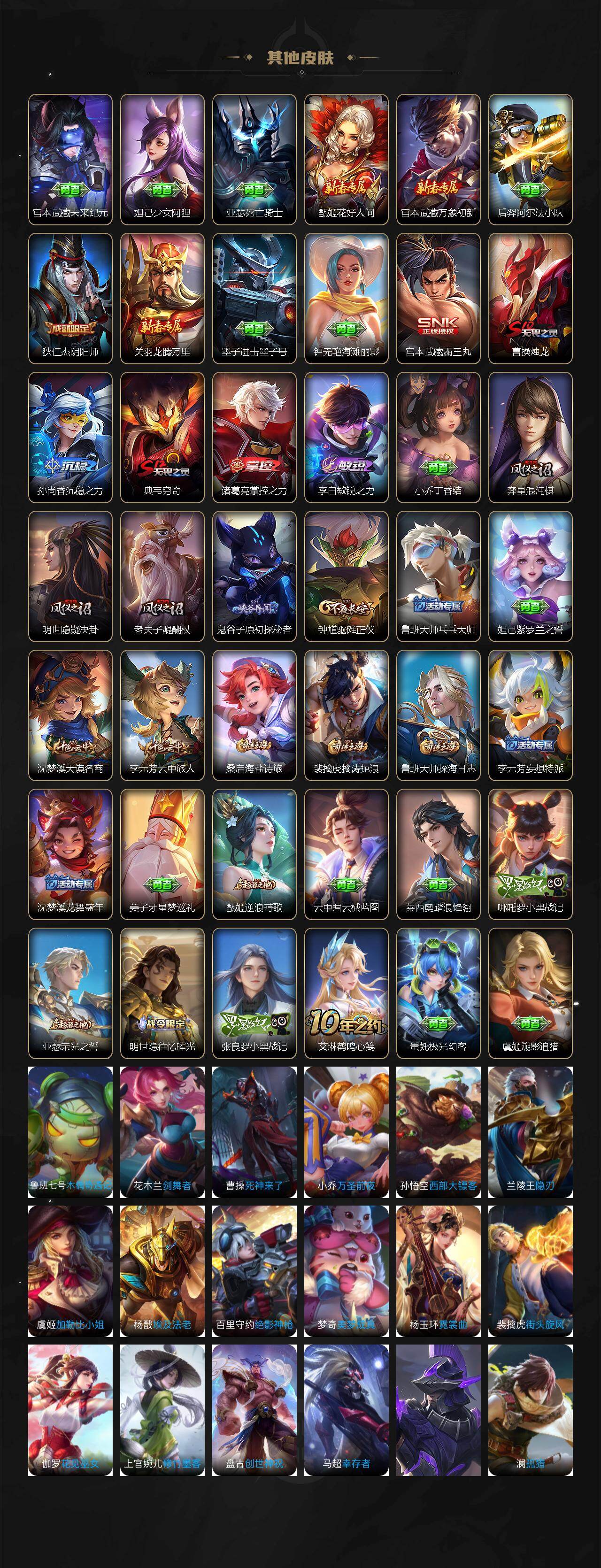【限定皮肤】:狄仁杰阴阳师,赵云皇家上将,曹操烛龙,典韦穷奇,狄仁杰魔术师,项羽海滩派对,老夫子醍醐杖,孙悟空至尊宝,李元芳云中旅人,钟馗驱傩正仪,鬼谷子原初探秘者,弈星混沌棋,沈梦溪大漠名商,明世隐疑决卦,裴擒虎