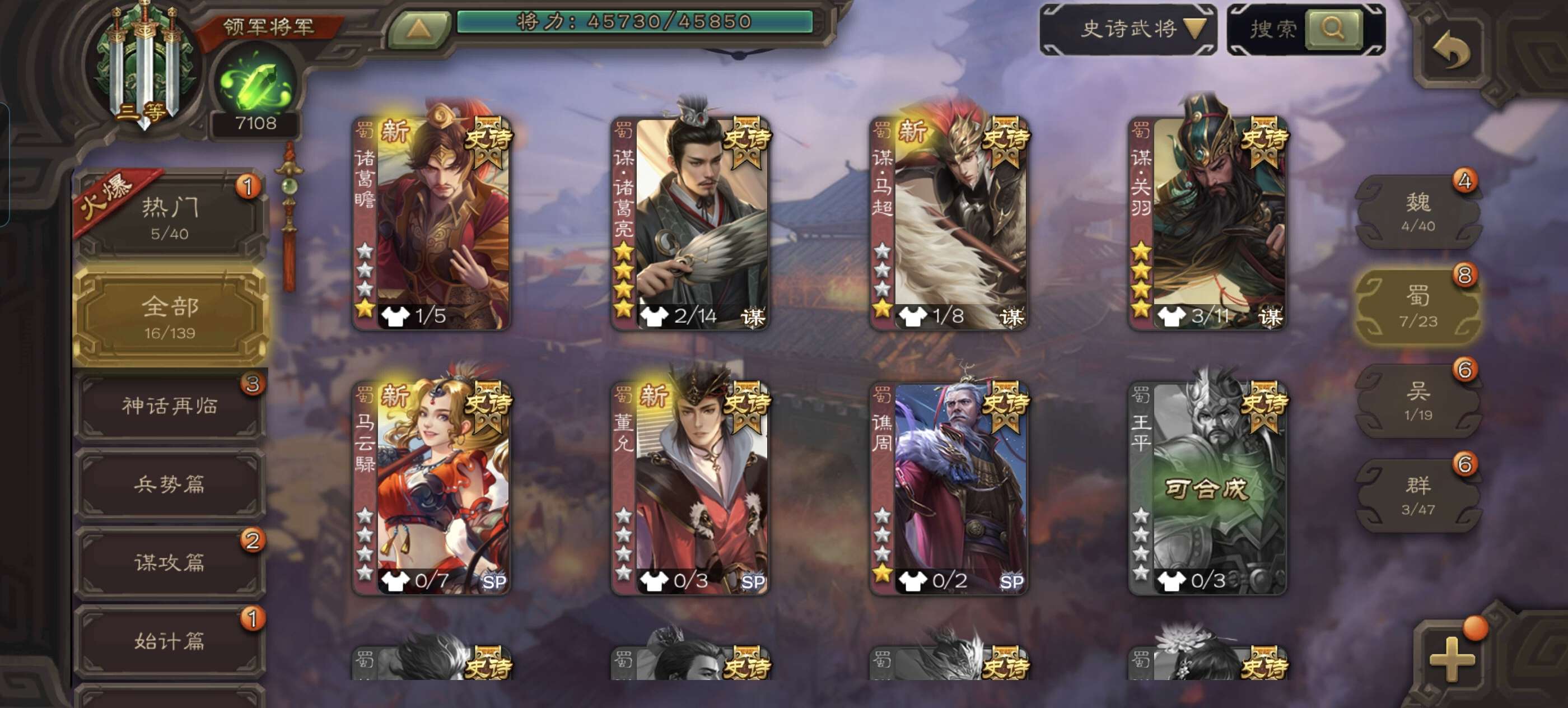 15史诗,典藏谋关羽,龙限谋诸葛,界徐盛,戏志才,界钟会,诸葛瞻,星董卓,界李儒,资源充足