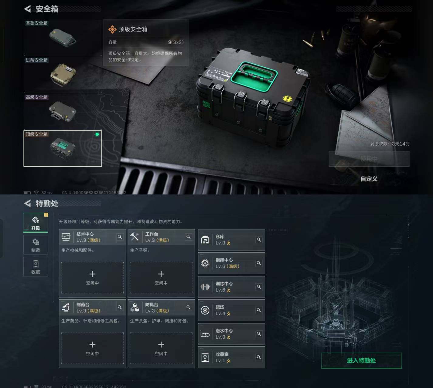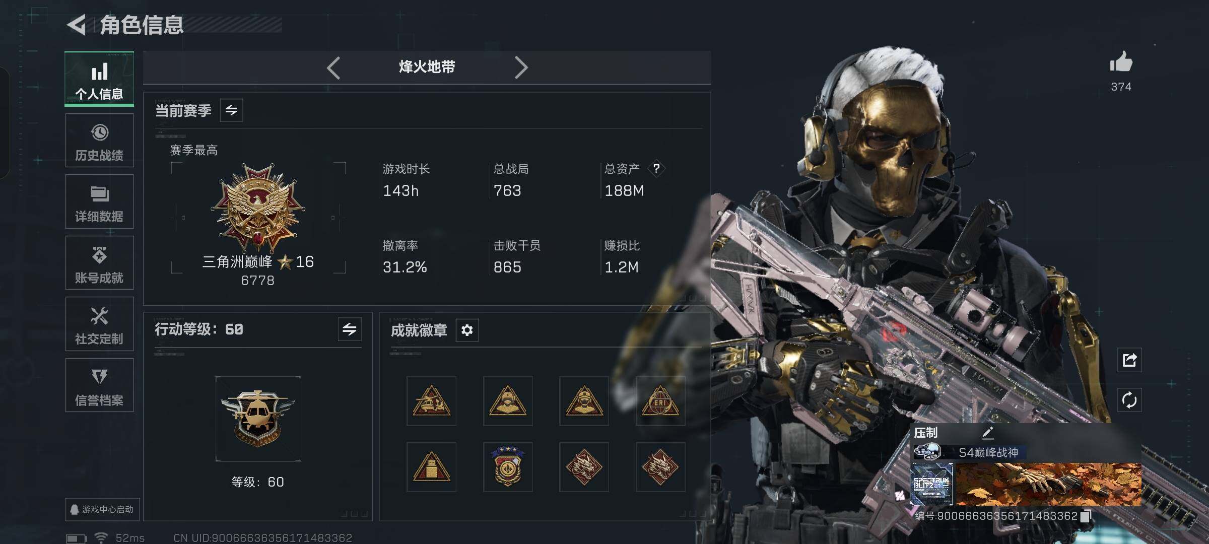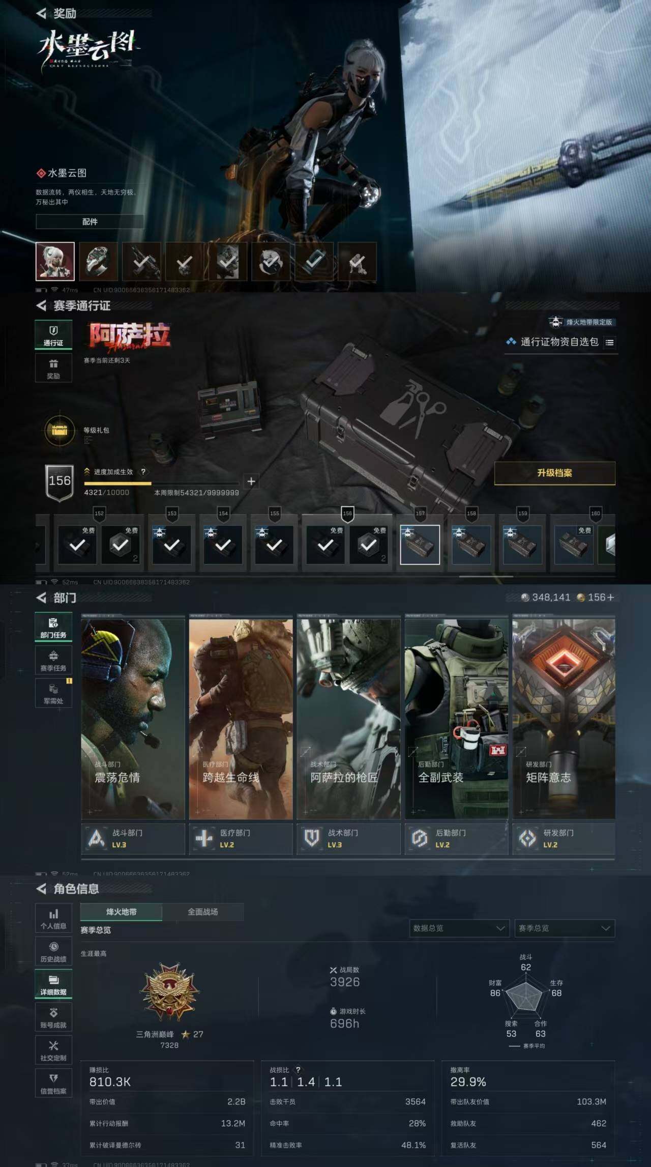 aa14,送王者v9,3刀皮影锋套龙牙,5典藏枪,8干员皮肤蚀金玫瑰壮志凌云夜鹰维什戴尔等,命运王牌S电玩S神力,气象感应,棱镜攻势S2,总资产188M,30橙枪,水墨云图差2发,特勤快满,仓库9级训练中心6级靶场4级