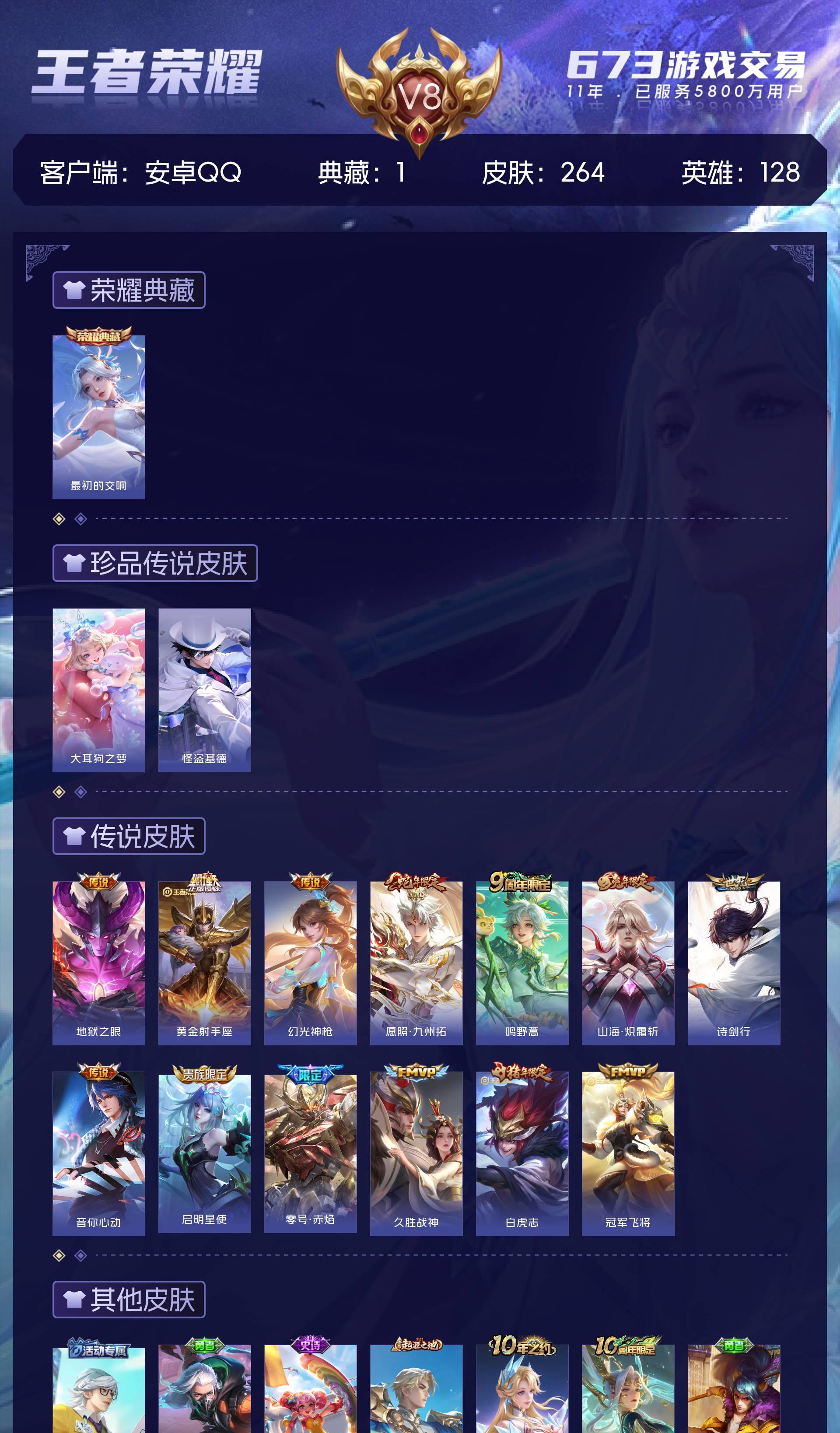 V8 皮肤264 英雄128 永恒钻石 荣耀典藏1 珍品传说2 传说13 其他皮肤254