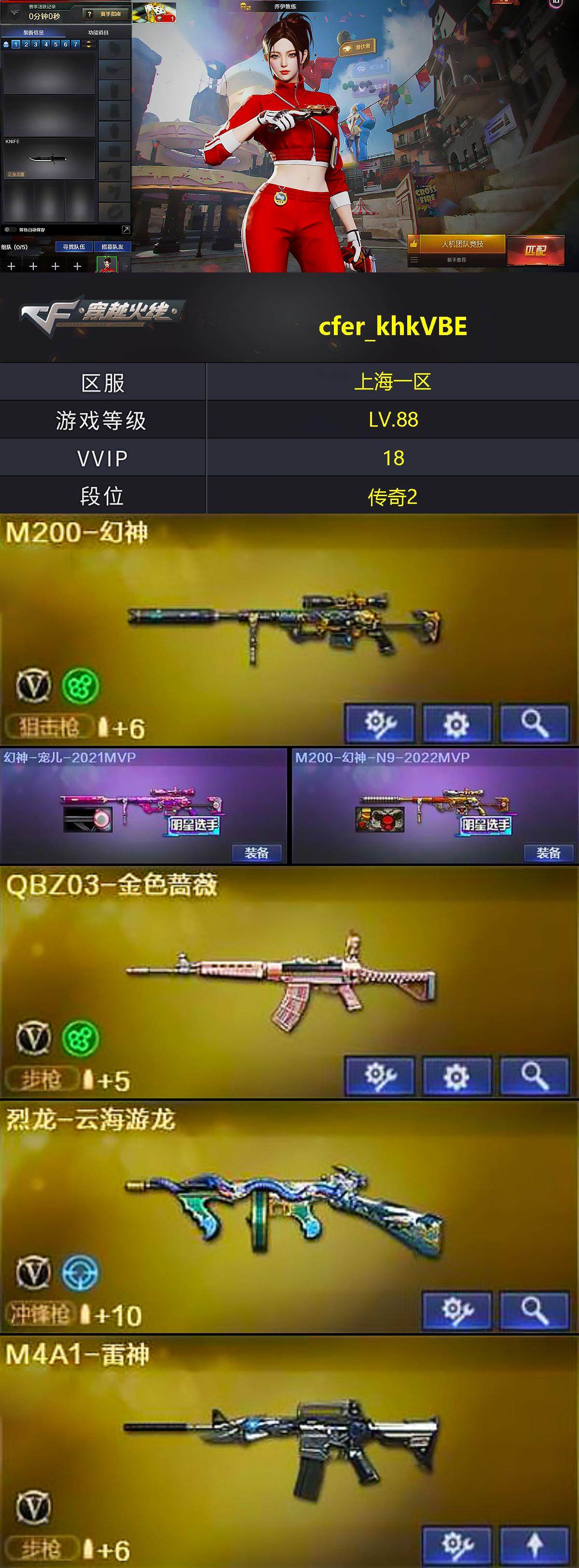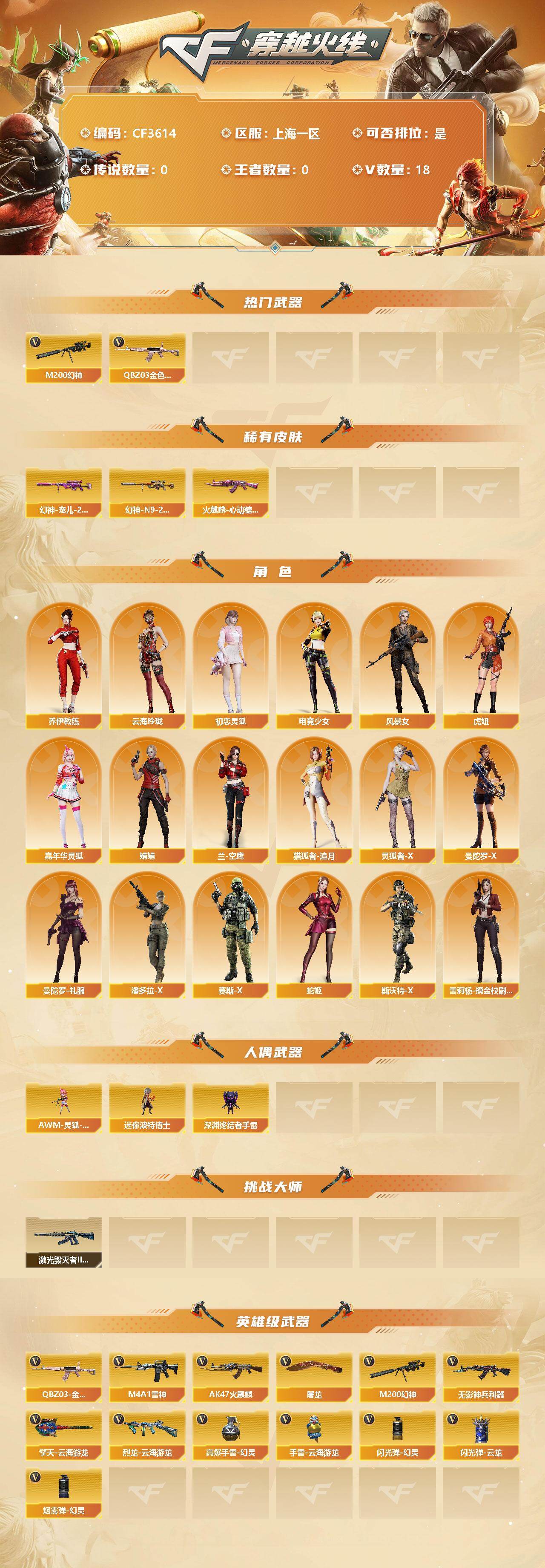 【CF3614】上海一区-18V-0王者-0炫金【双全号/QBZ03-金色蔷薇,M200-幻神】