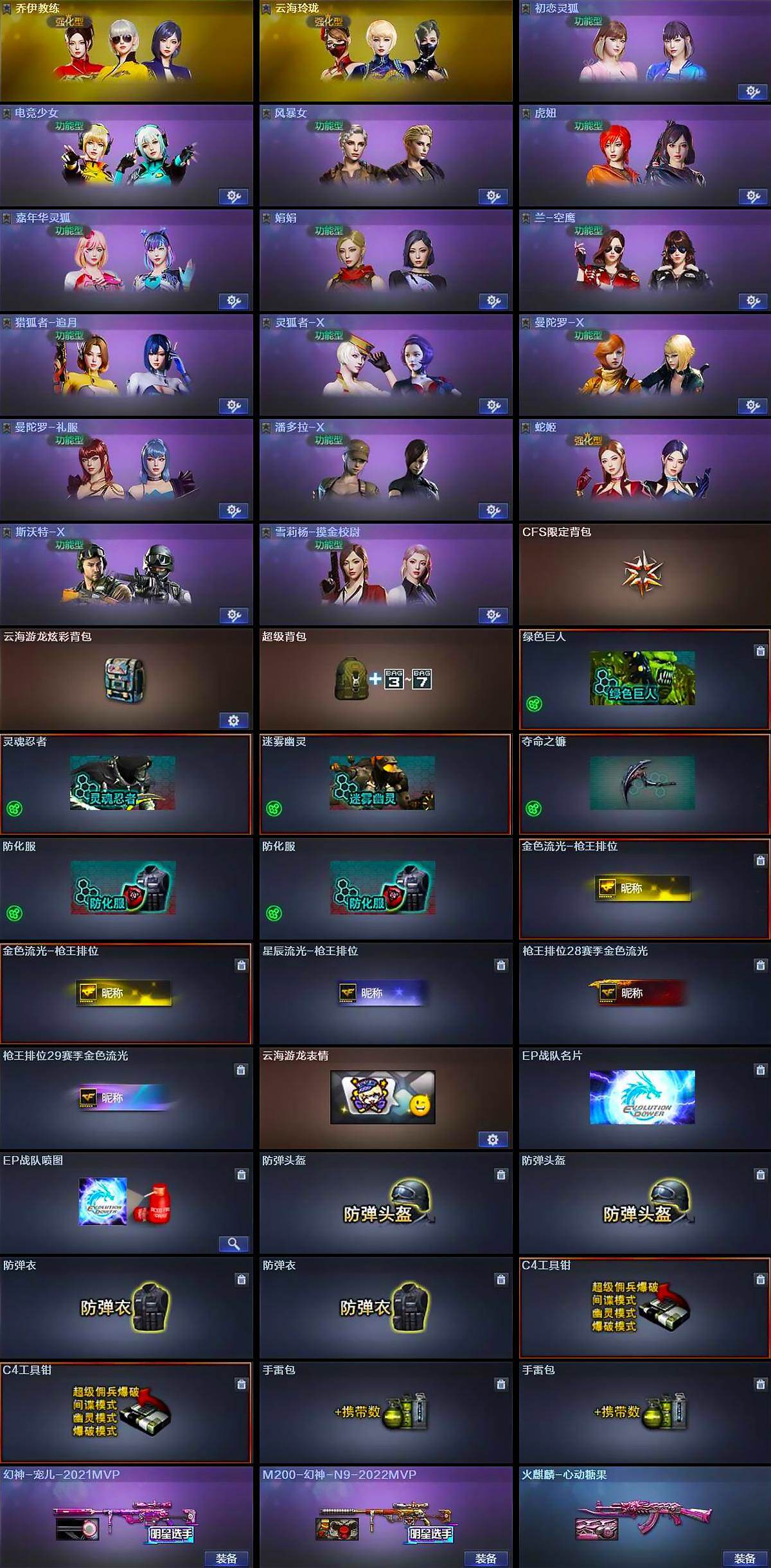【角色】:乔伊教练,云海玲珑,初恋灵狐,电竞少女,风暴女,虎妞,嘉年华灵狐,娟娟,兰-空鹰,猎狐者-追月,灵狐者-X,曼陀罗-X,曼陀罗-礼服,潘多拉-X,赛斯-X,蛇姬,斯沃特-X,雪莉杨-摸金校尉