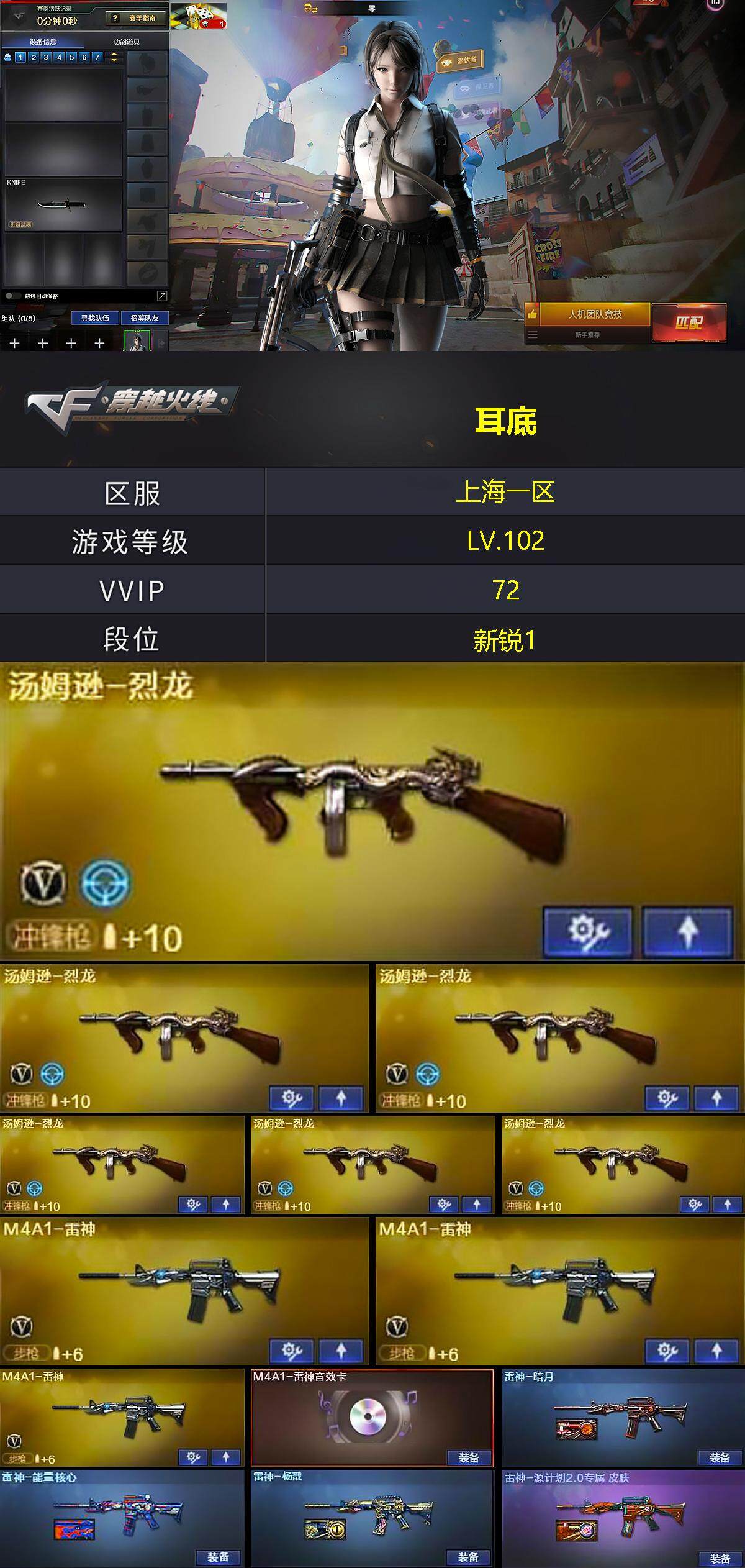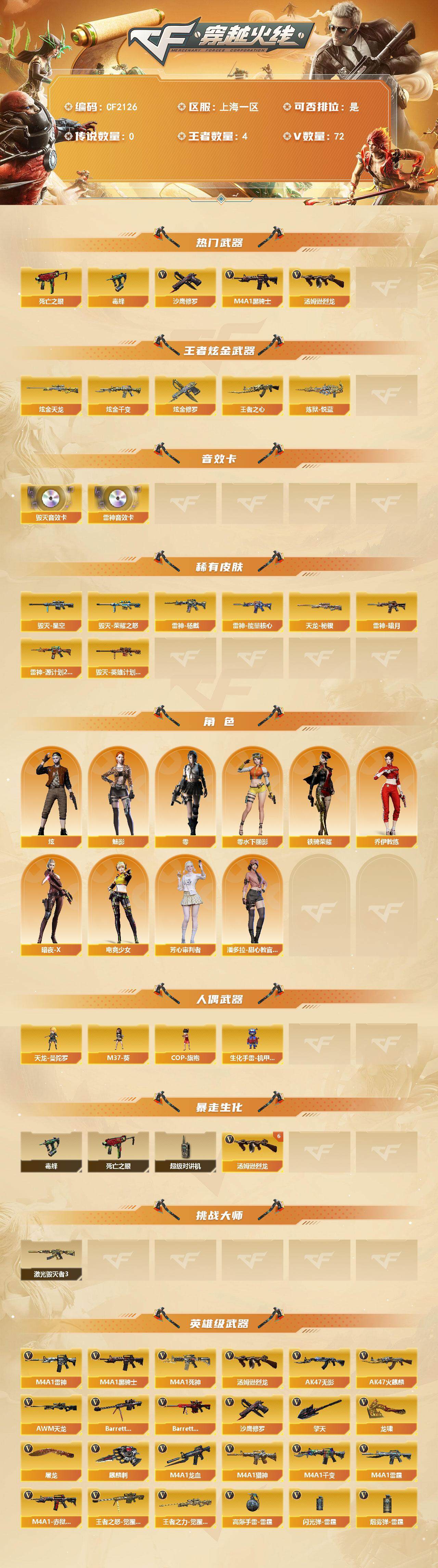 【CF2126】上海一区-72V-4王者-4炫金【双全号 死亡之眼,毒蜂*2,M4A1-黑骑士,汤姆逊-烈龙*6,沙鹰-修罗*8】
