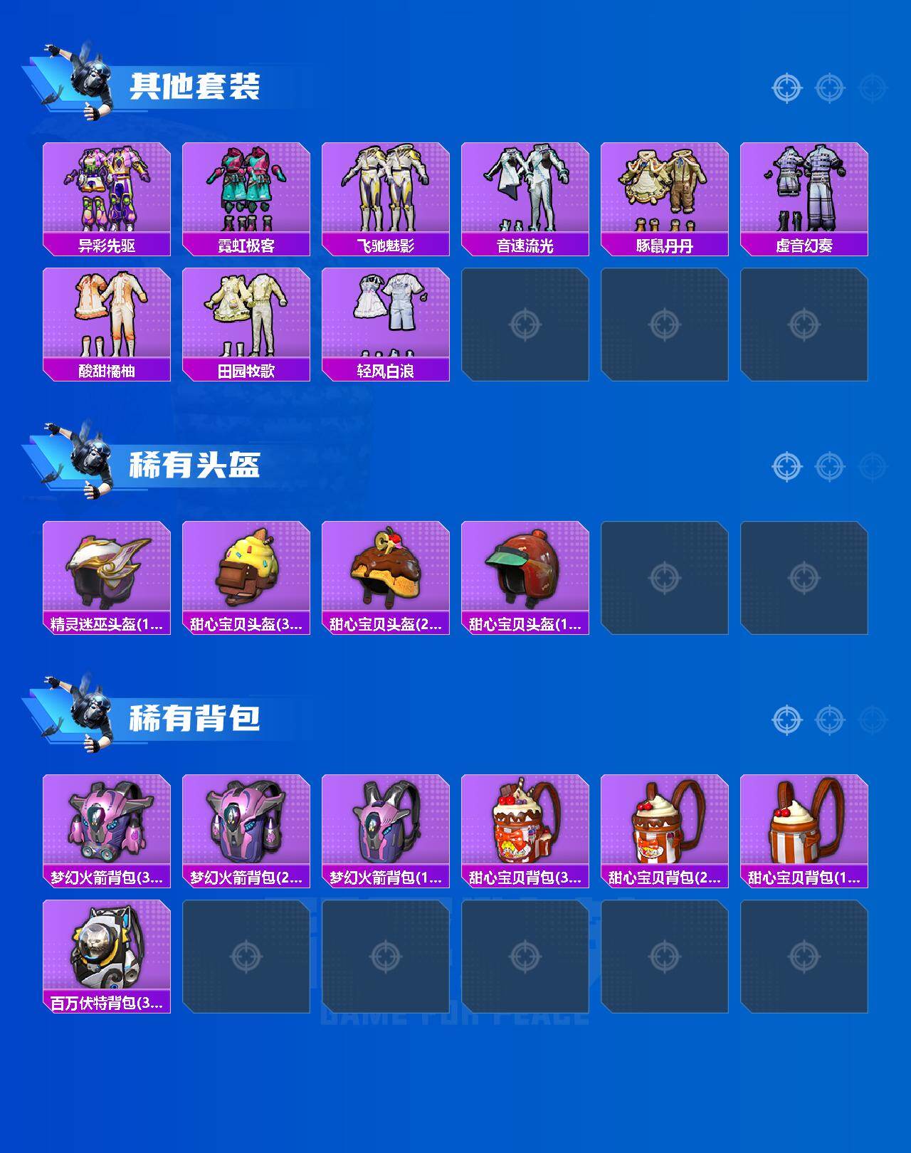 小号 粉装-梦幻火箭/粉装-宝贝奶油派/百万伏特背包(3级)/AKM-甜心宝贝(七级)/DP-28-豹影疾电(四级)/MG3-洛神天依(七级)