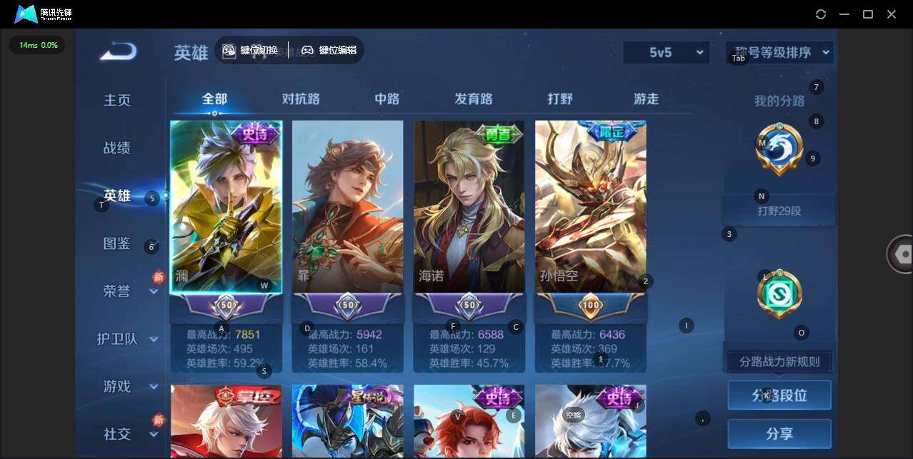 /实名: 可修改 贵族等级: V6 英雄数: 114 皮肤数: 114 星传说: 幽冥之眼 传说皮: 零号·赤焰,地狱之眼,无双飞将,神树通天 限定皮: 李小龙,鸣野蒿