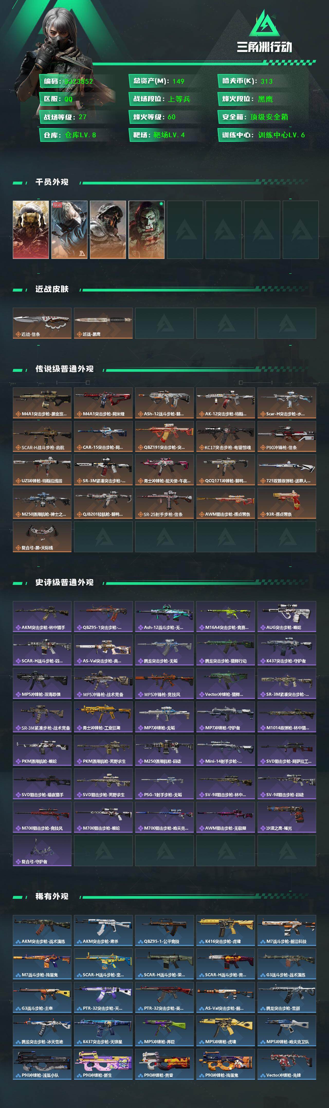 【SJZ3852】总资产(M):149M/哈夫币(K):313K/哈夫币(K):313K/传说枪皮数:21/全面战场等级:27_段位:上等兵/烽火地带等级:60_段位:黑鹰/红狼-蚀金玫瑰/蜂医-送葬人·无题密令/深蓝-不破誓约/红狼-电锯惊魂/近战-信条/近战-黑鹰/M4A1突击步枪-蚀金玫瑰/M4A1突击步枪-阿米娅/ASh-12战斗步枪-鹅鸭杀/AK-12突击步枪-特斯拉线圈/SCAR-H战斗步枪-水墨云图/SCAR-H战斗步枪-启航/CAR-15突击步枪-阿米娅/腾龙突击步枪-捞点薯条/