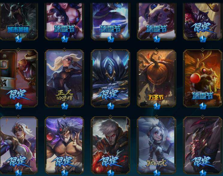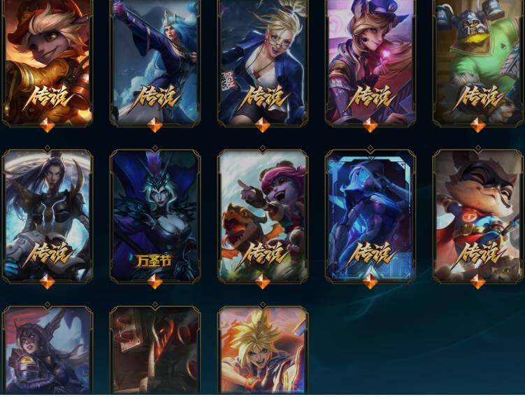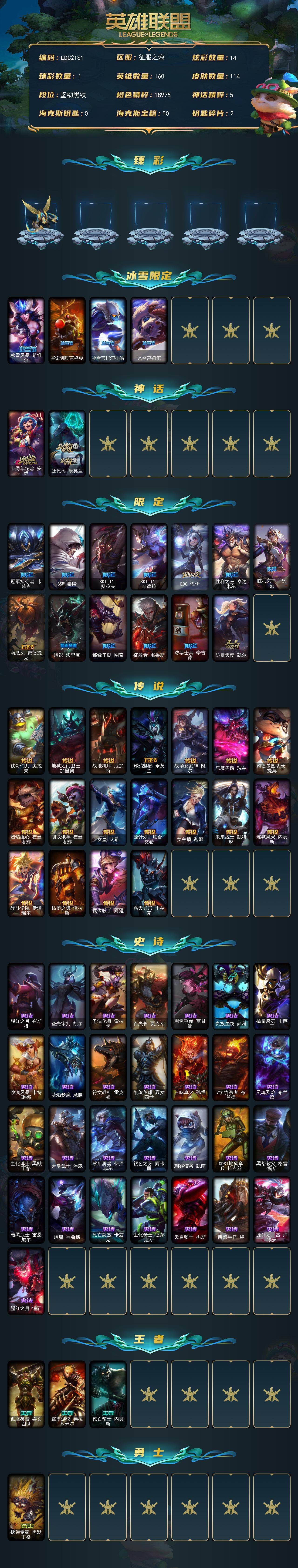 160英雄/114皮肤/2神话/17限定/1臻彩/14炫彩/18传说/29史诗