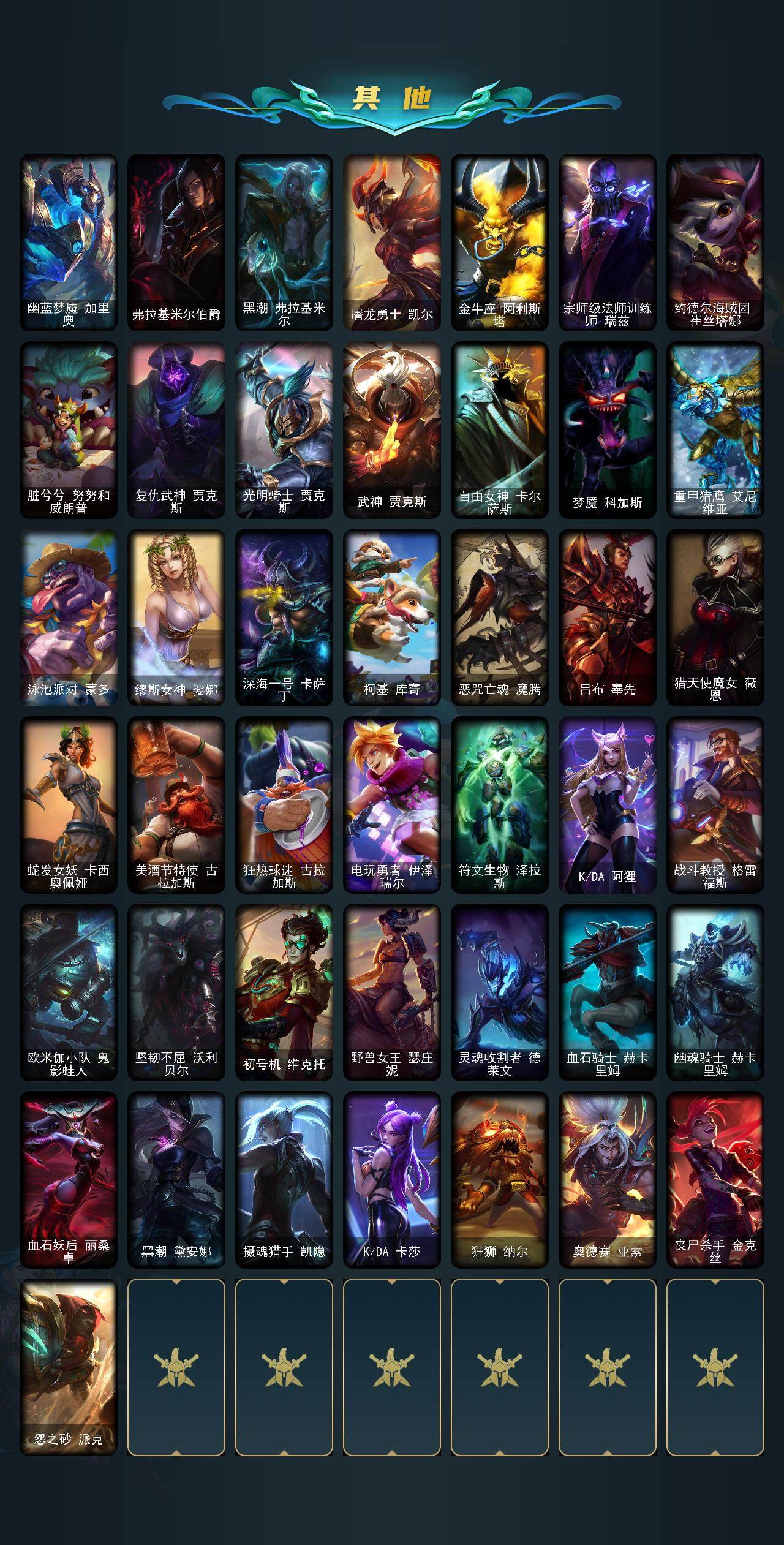 【LDC2181】160英雄/114皮肤/2神话/17限定/1臻彩/14炫彩/18传说/29史诗/未定级/冠军掠夺者卡兹克凯旋圣装/冰雪风暴希维尔/圣诞驯鹿克格莫/冰雪节玛尔扎哈/冰雪兽纳尔/十周年纪念安妮/源代码乐芙兰/冠军掠夺者卡兹克/SSW泰隆/SKTT1奥拉夫/SKTT1辛德拉/EDG佐伊/胜利之王泰达米尔/胜利女神菲奥娜/南瓜头费德提克/暗影沃里克/都铎王朝图奇/征服者韦鲁斯/防暴士兵辛吉德/防暴天使凯尔/铁哥们儿奥拉夫/地狱之门卫士加里奥/战地机甲厄加特/邪鸦魅影乐芙兰/战场女武神凯