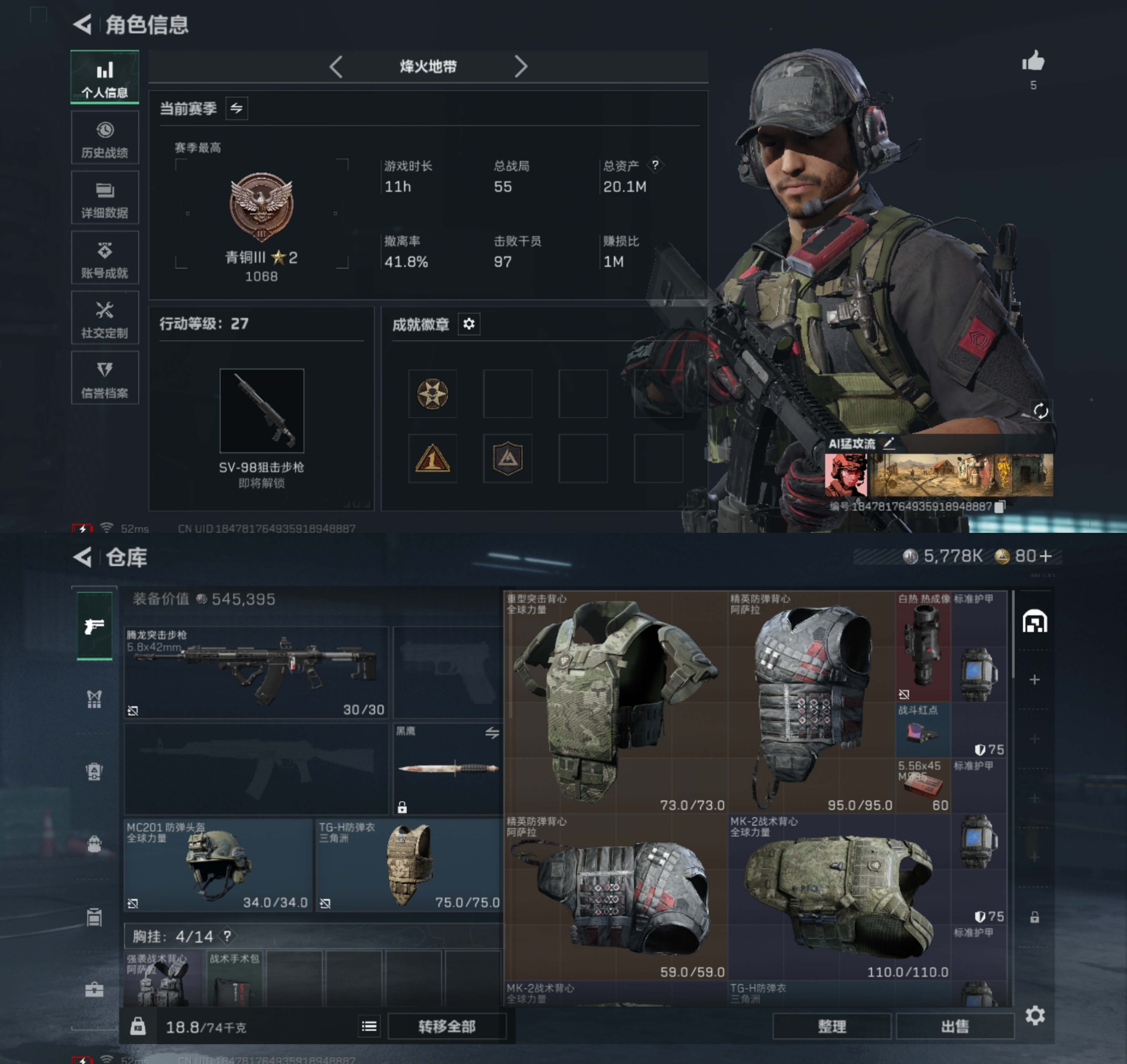 DD458安Q三角洲【总资20.1M 烽火等级27级 5778K哈弗币】【传说枪皮】M4A1突击步枪-阿米娅【史诗枪皮】SCAR-H战斗步枪-囚徒 ASh-12战斗步枪