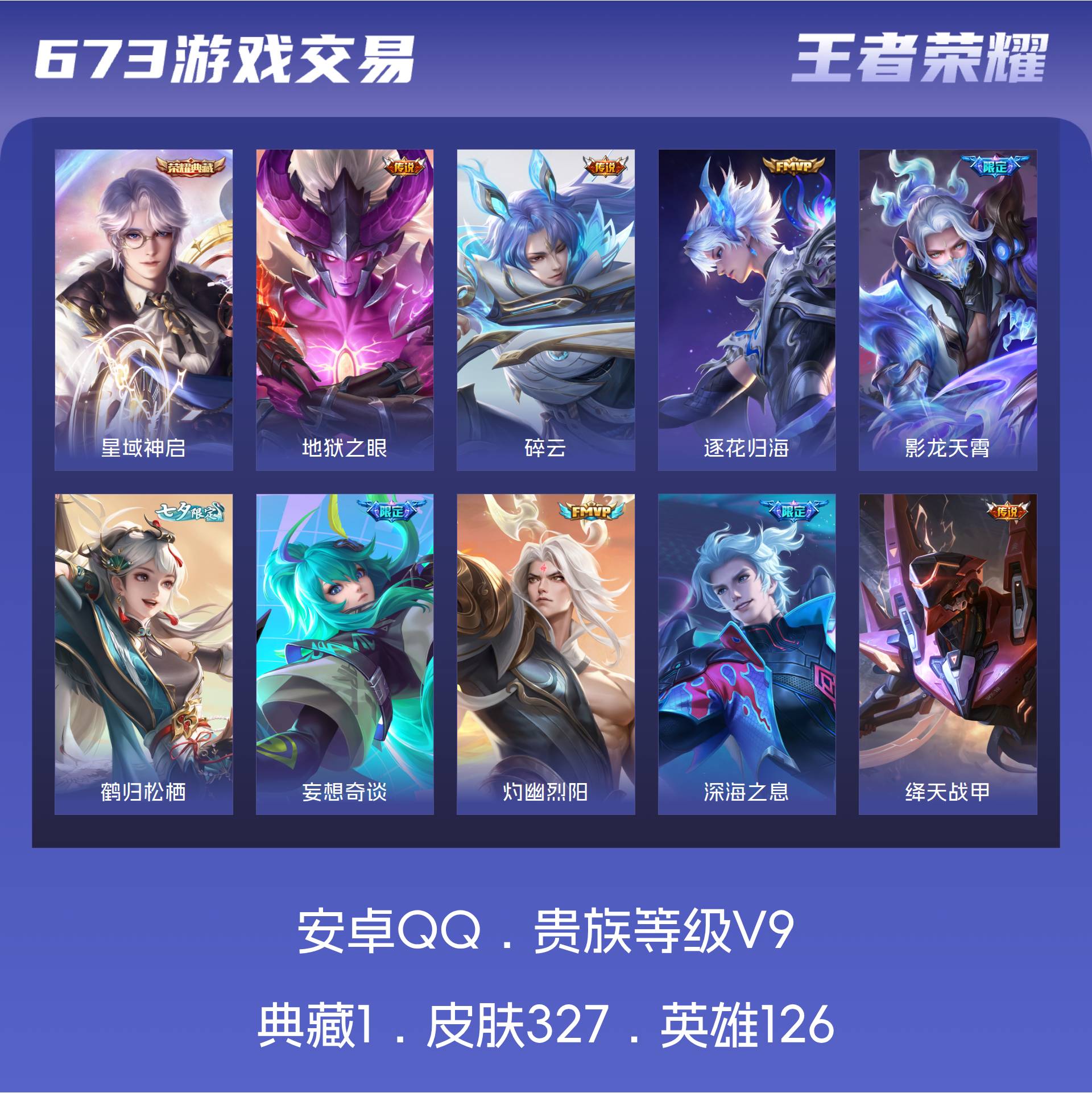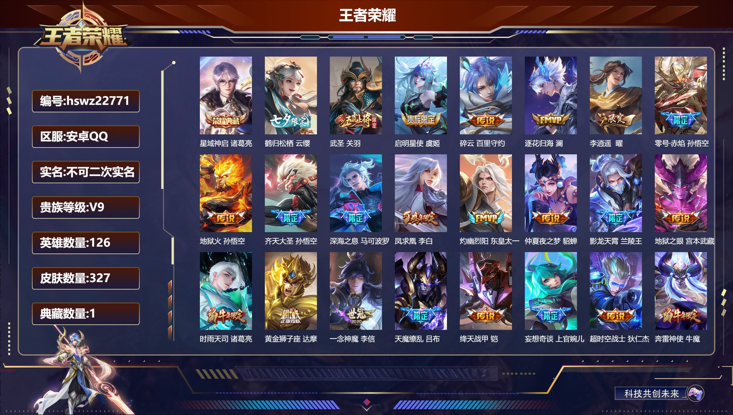 安卓QQ/非凡王者/327皮肤/126英雄/1典藏/0珍品无双/0无双/0珍品传说/22传说/94史