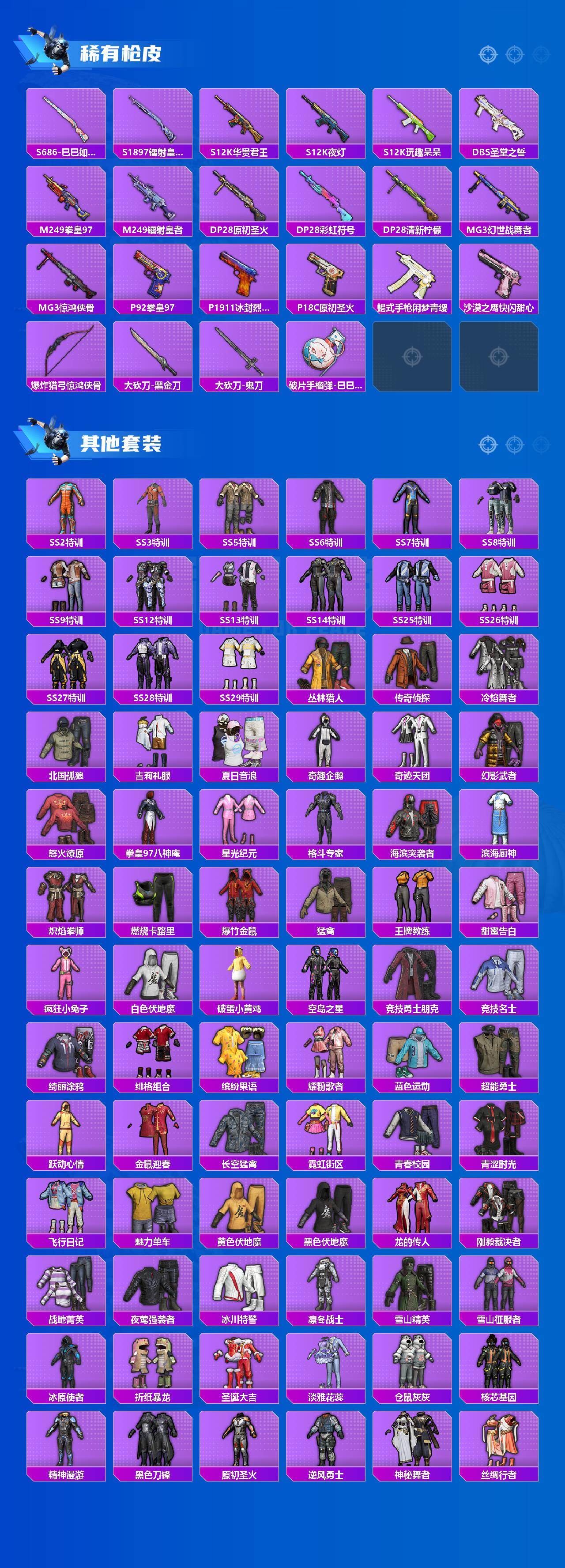 【粉色枪皮等级】:SCAR-L-锦绣绵绵(五级),M416-心之恋语(七级),Kar98K-巳巳如意(五级),SVD-月影灵韵(五级),DP-28-圣堂之誓(七级),DP-28-豹影疾电(四级)