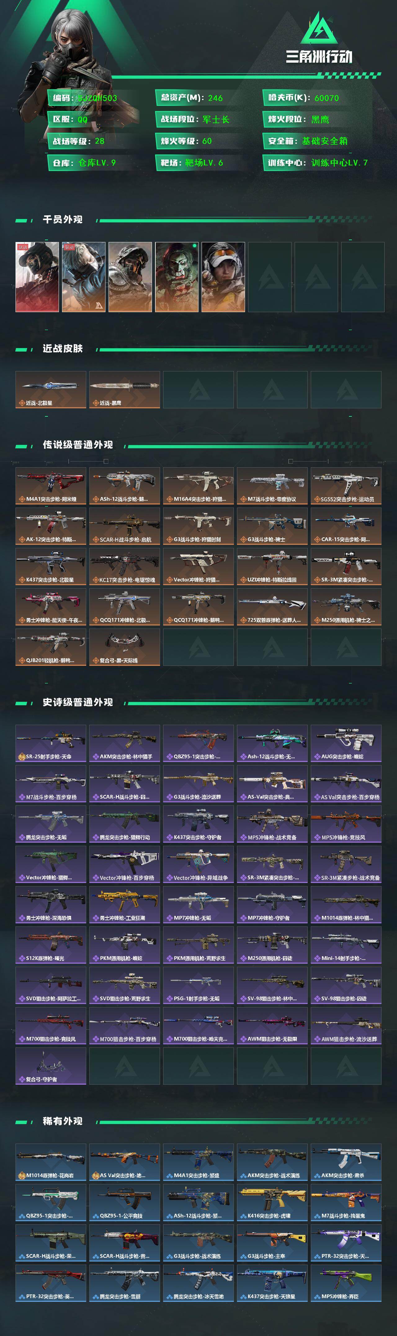 【SJZQH503】总资产(M):246M/哈夫币(K):60070K/哈夫币(K):60070K/传说枪皮数:22/全面战场等级:28_段位:军士长/烽火地带等级:60_段位:黑鹰/露娜-黑·天际线/蜂医-送葬人·无题密令/深蓝-不破誓约/红狼-电锯惊魂/露娜-金牌射手/近战-北极星/近战-黑鹰/M4A1突击步枪-阿米娅/ASh-12战斗步枪-鹅鸭杀/M16A4突击步枪-狩猎时刻/M7战斗步枪-零度协议/SG552突击步枪-运动员/AK-12突击步枪-特斯拉线圈/SCAR-H战斗步枪-启航/G