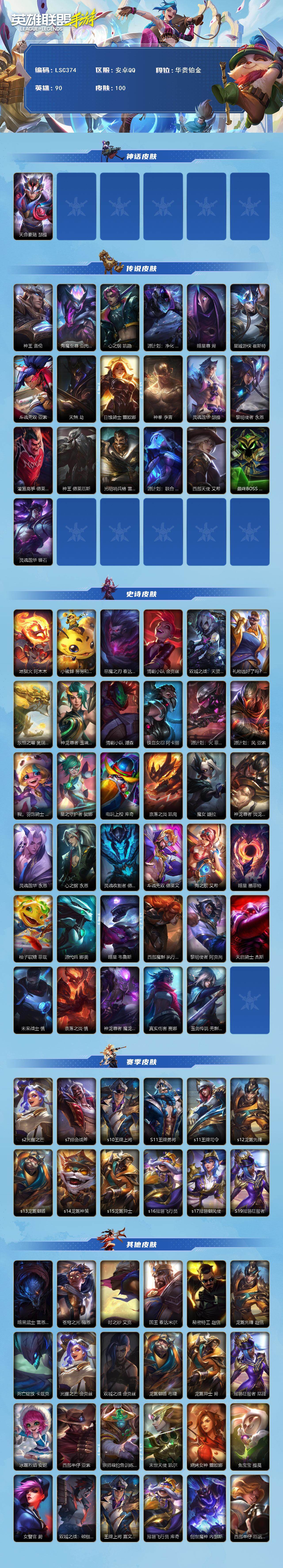 【LSC374】90英雄/100皮肤/1神话/19传说/华贵铂金/天命豪赌 瑟提/神王 盖伦/海魔至尊 亚托克斯/心之钢 凯隐/源计划:净化 薇恩/暗星尊 烬/星域游侠 崔斯特/斗魂无双 亚索/天煞 劫/日蚀骑士 蕾欧娜/神拳 李青/灵魂莲华 瑟提/黎明使者 永恩/灌篮高手 德莱厄斯/神王 德莱厄斯/光明哨兵 格雷福斯/源计划:联合 艾希/西部天使 艾希/最终BOSS 维迦/灵魂莲华 锤石/地狱火 阿木木/小蜜蜂 努努和威朗普/恶魔之刃 泰达米尔/清剿小队 金克丝/双城之战:天资 金克丝/礼物选