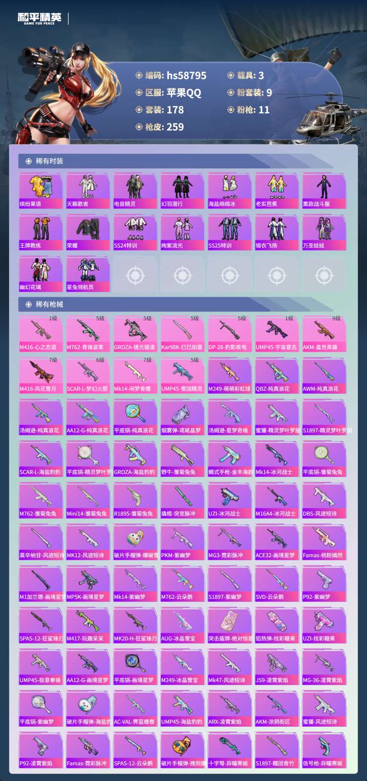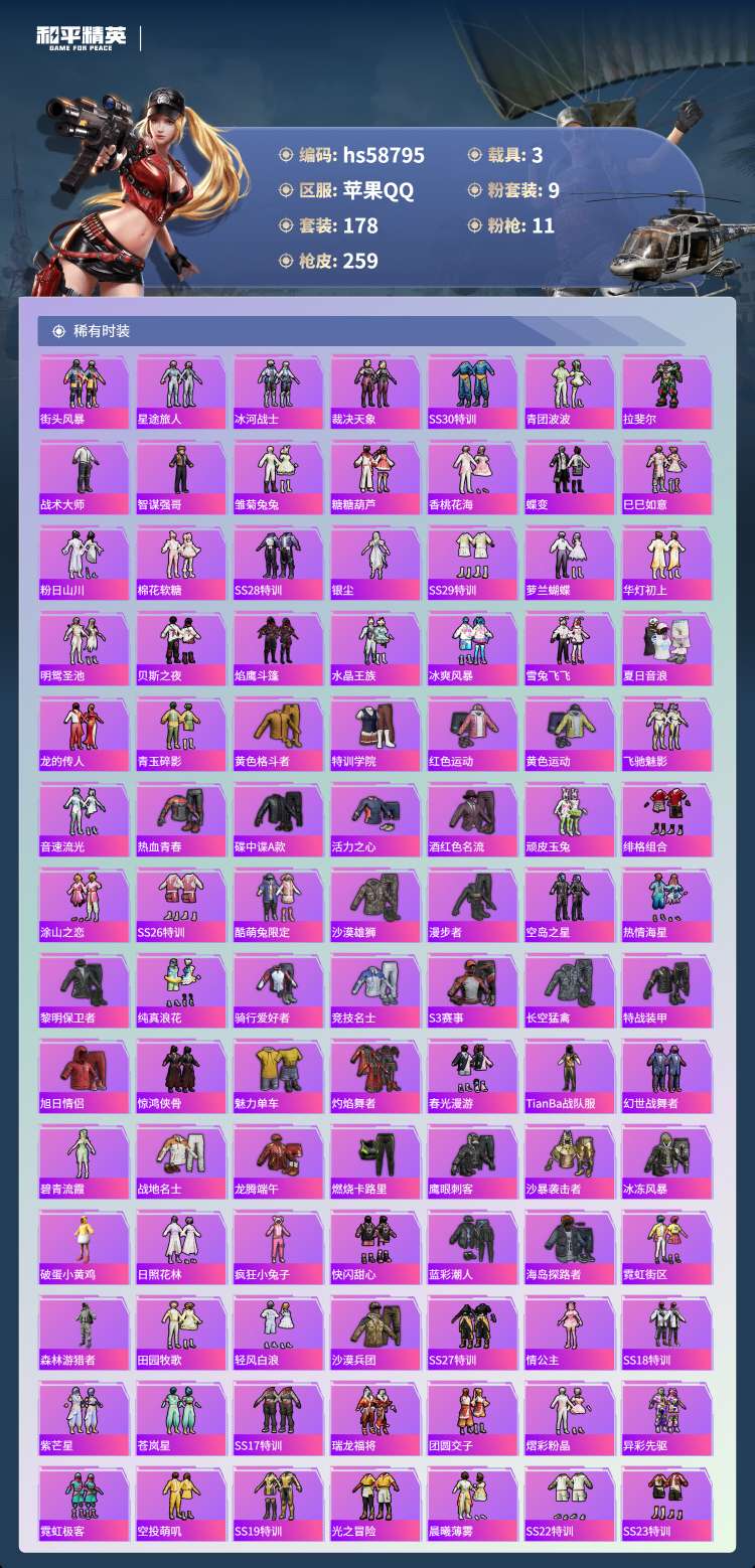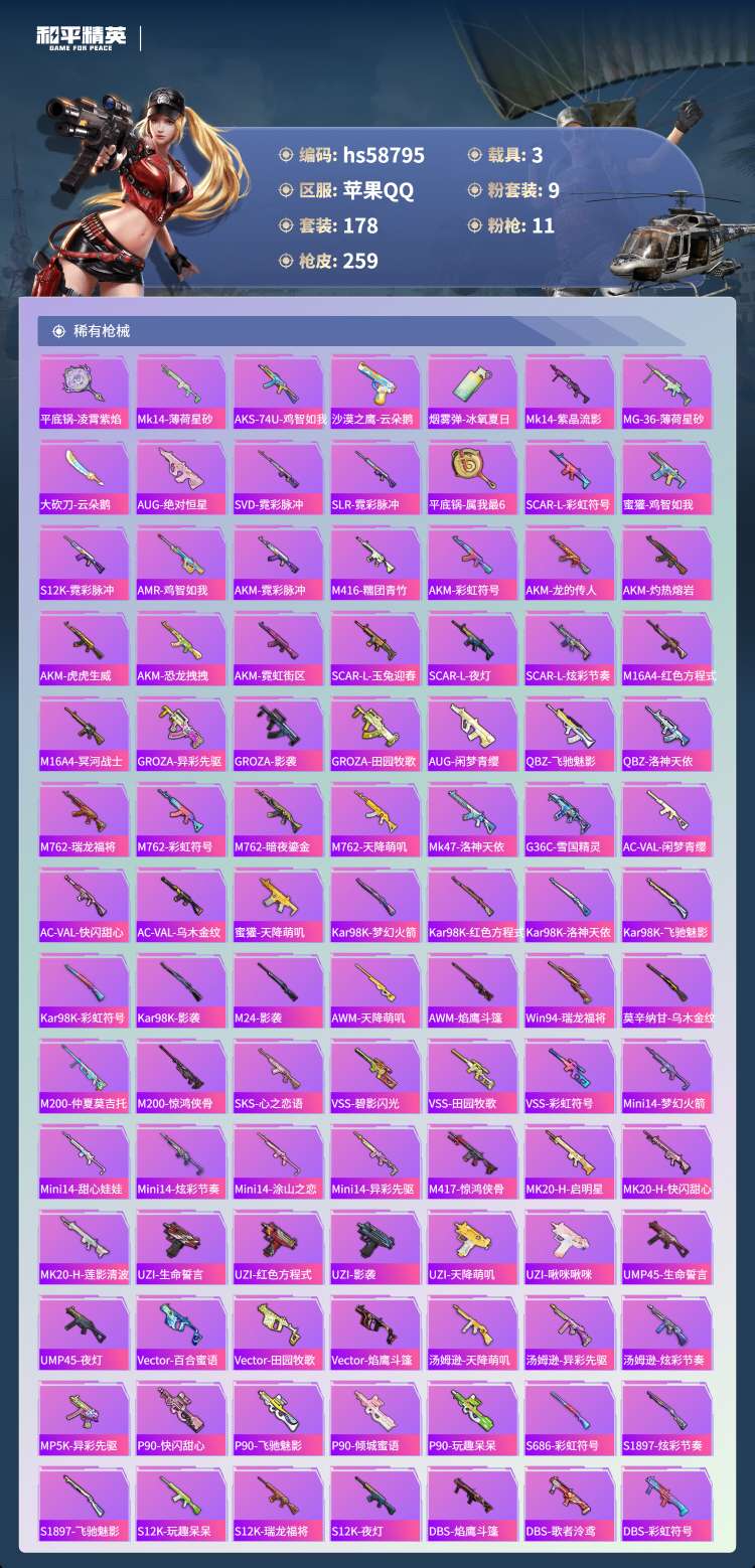 hs58795 苹果手Q-17王牌印记-9粉装-11特效枪-3载具-88379热力值-178套装-2
