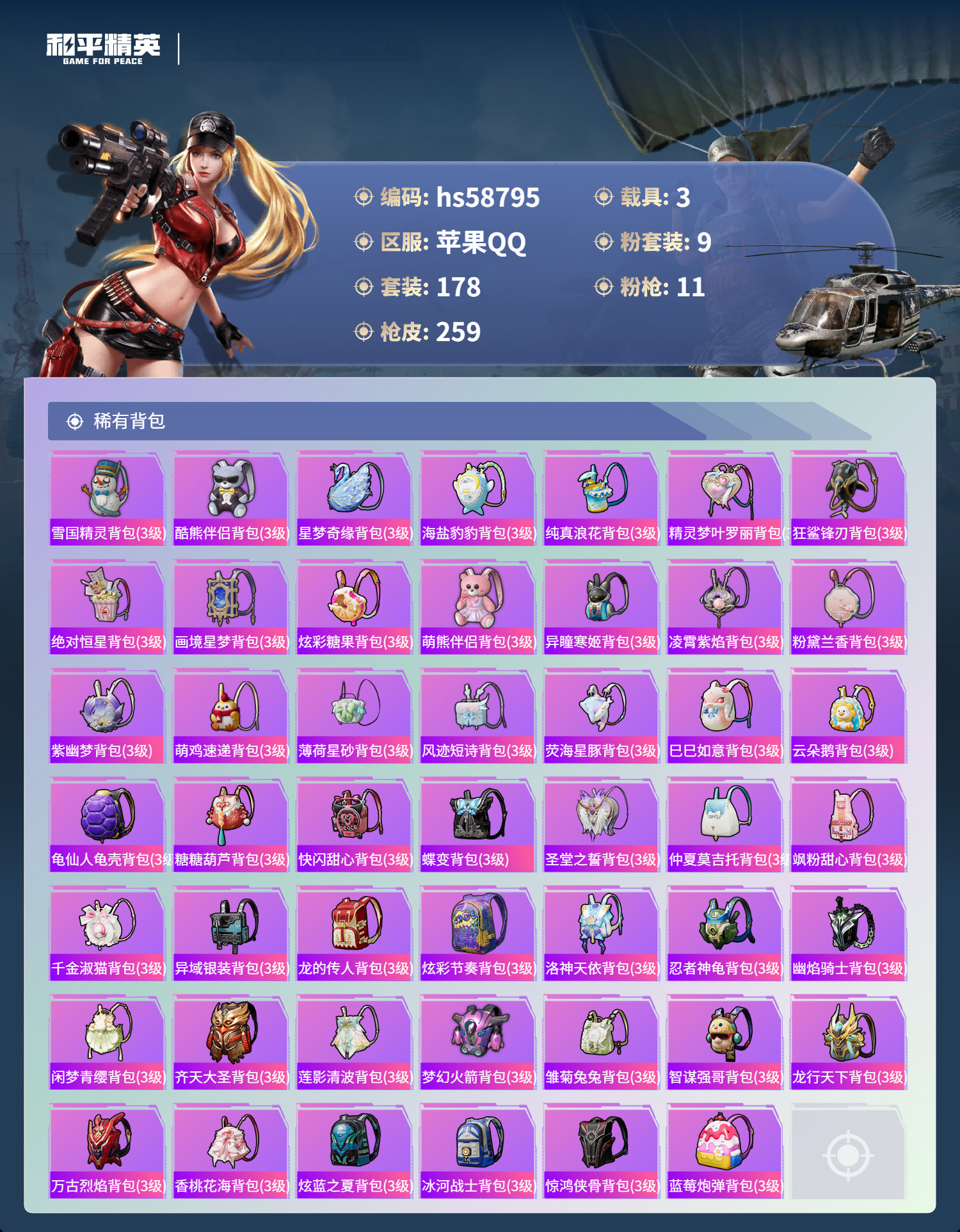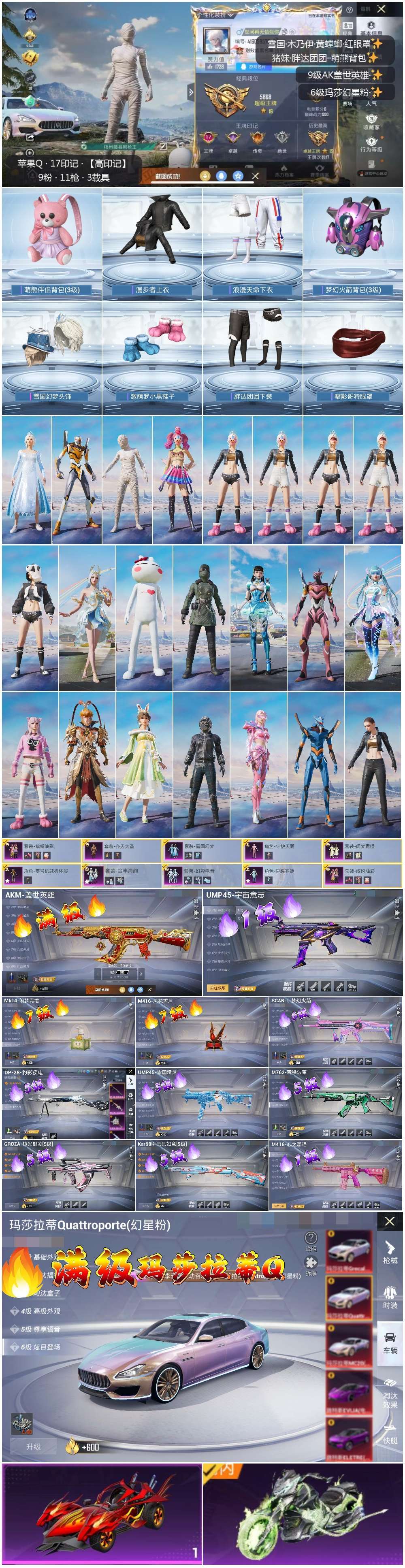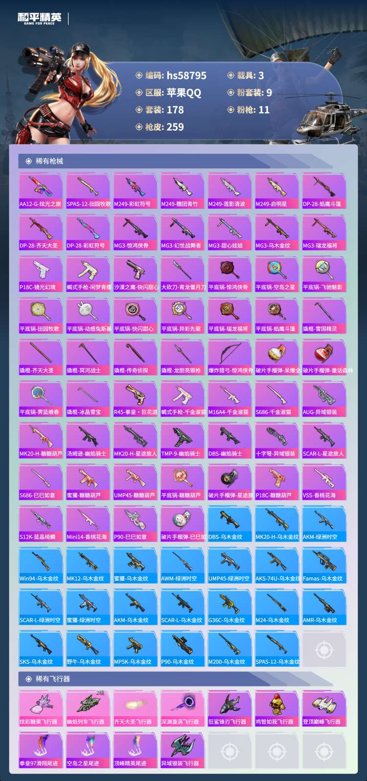 hs58795 苹果手Q-17王牌印记-9粉装-11特效枪-3载具-88379热力值-178套装-2