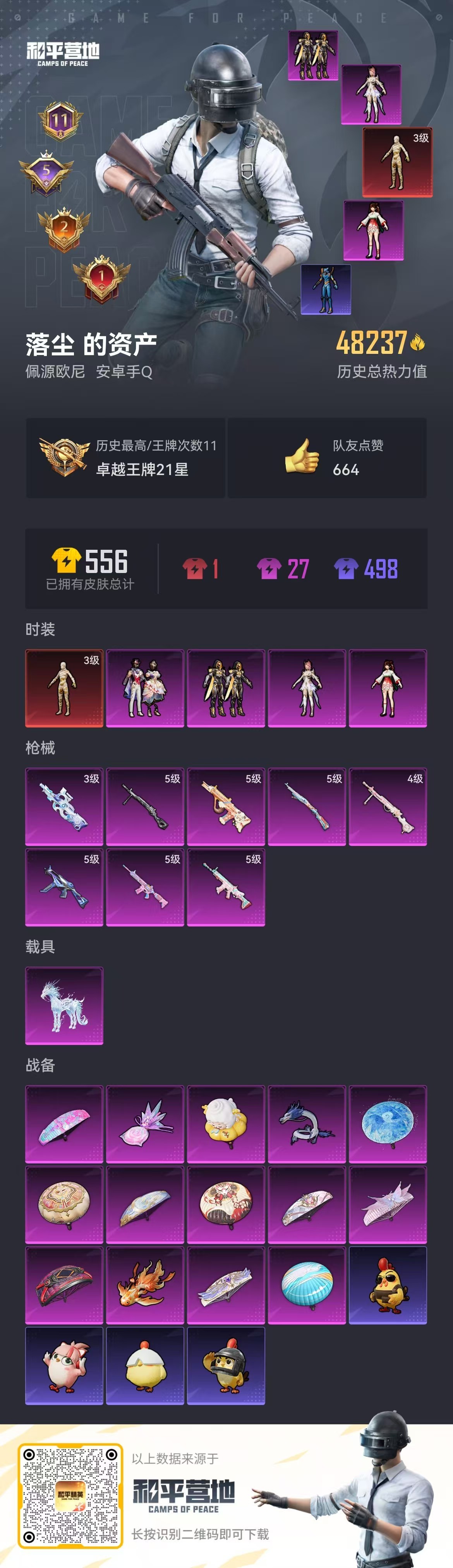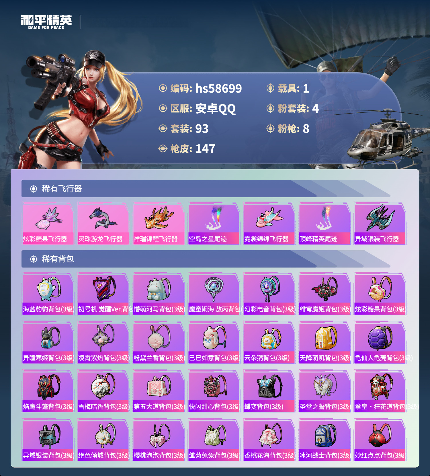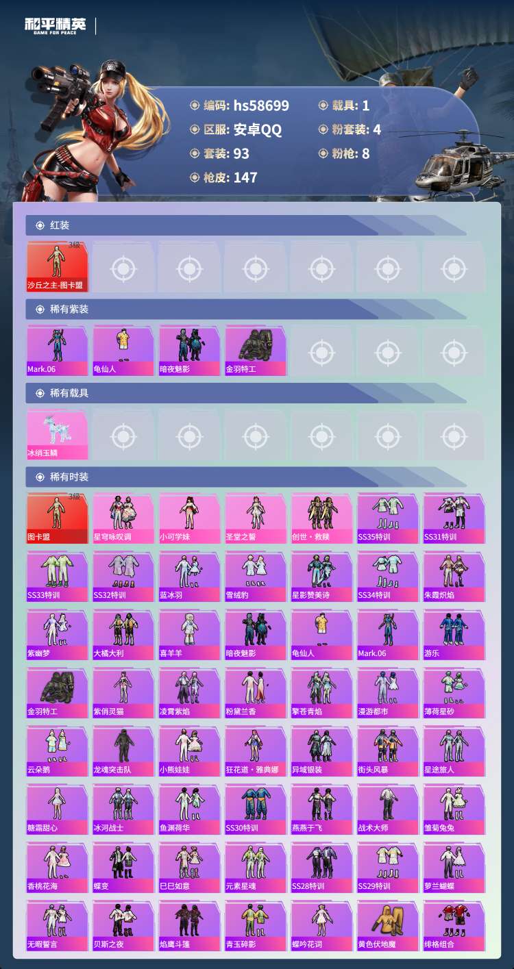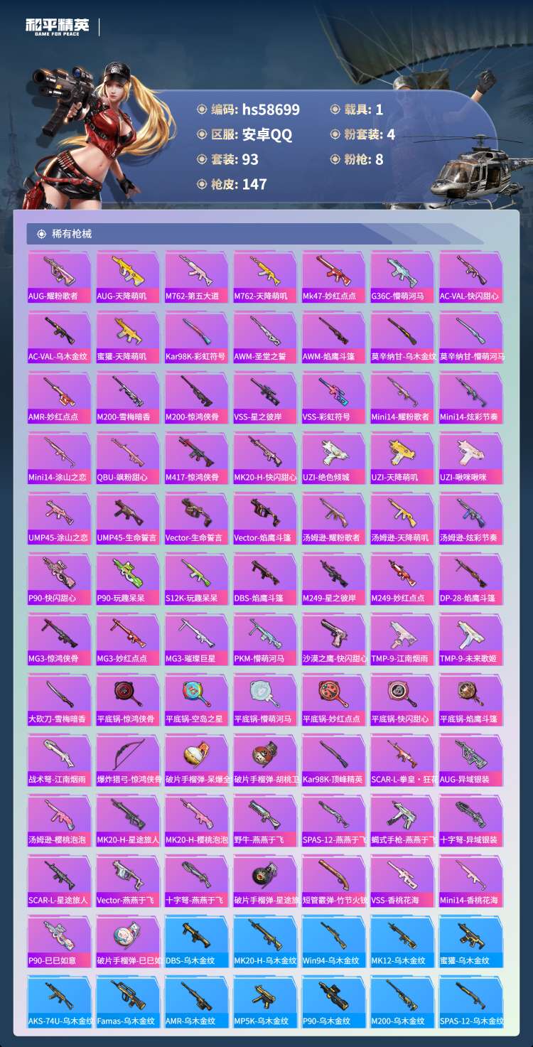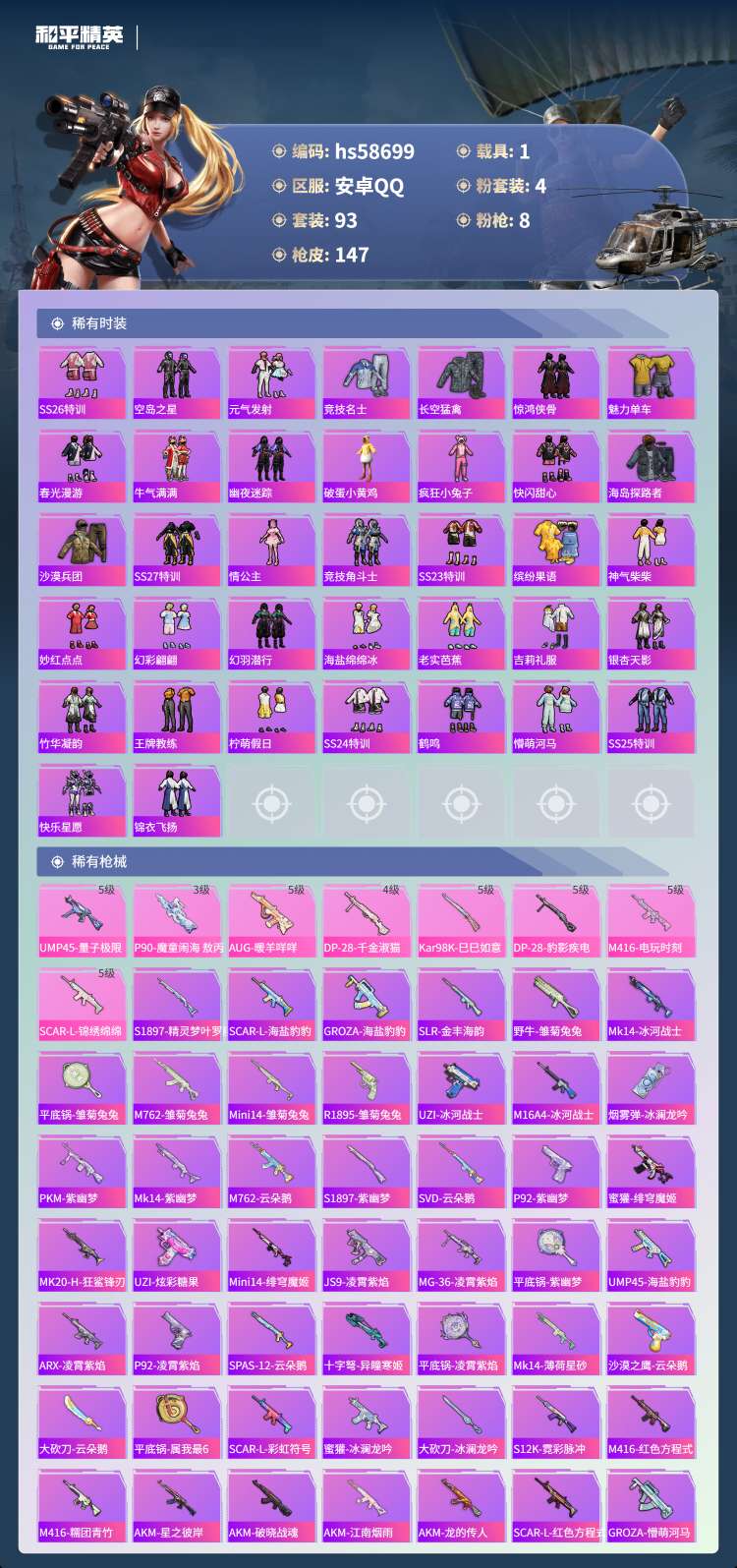 hs58699 安卓手Q-11王牌印记-1红装-4粉装-8特效枪-1载具-48237热力值-93套装