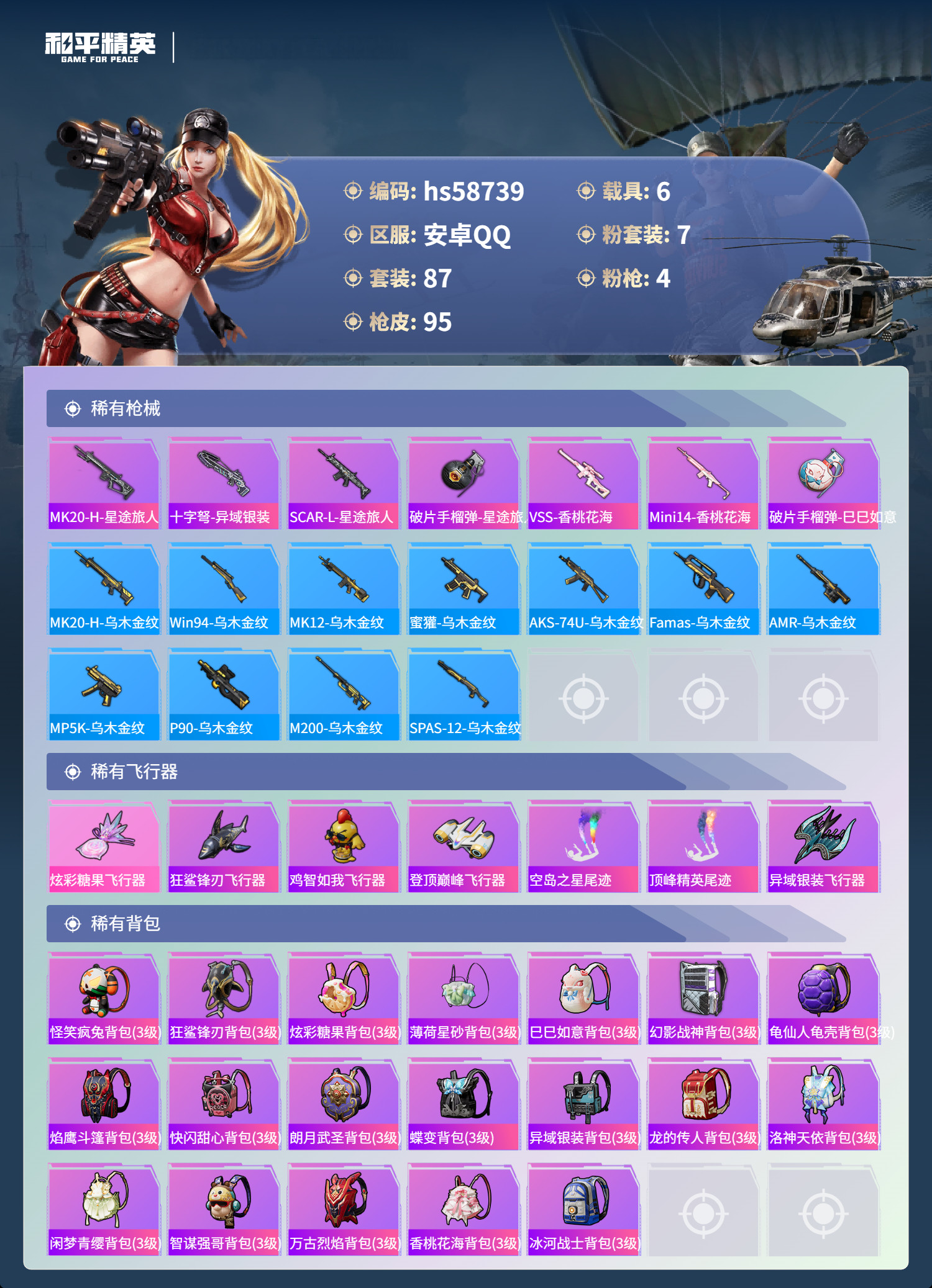 hs58739 安卓手Q-9王牌印记-7粉装-4特效枪-6载具-36048热力值-87套装-95枪皮