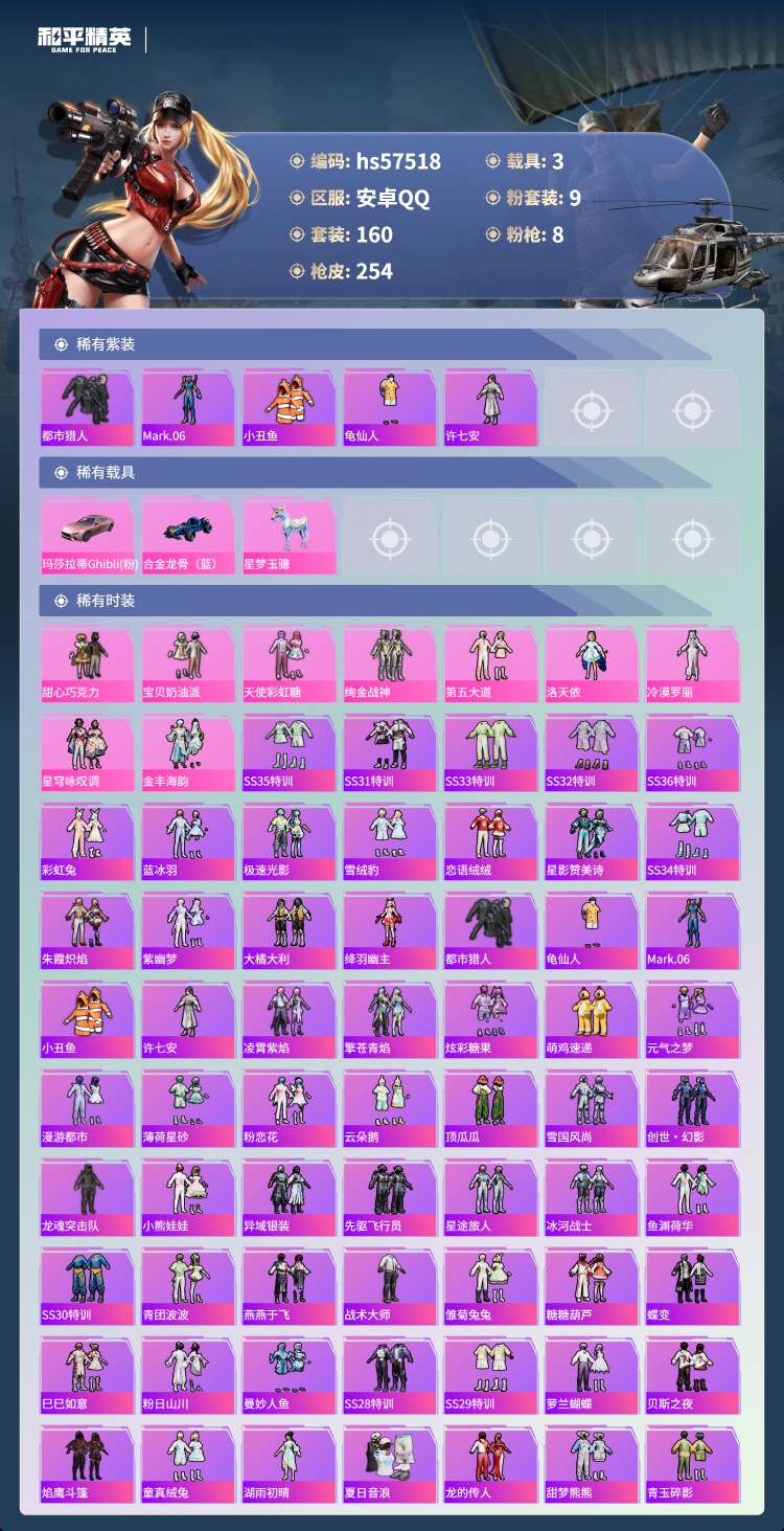 hs57518 安卓手Q-18王牌印记-有战神框-9粉装-8特效枪-3载具-77299热力值-160