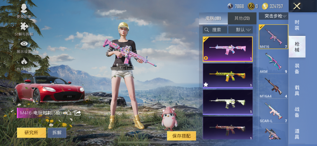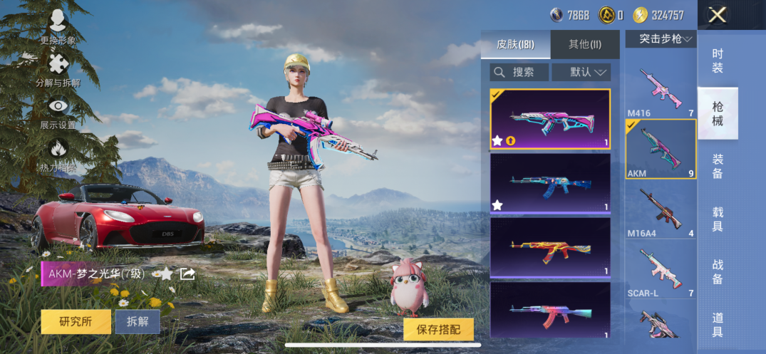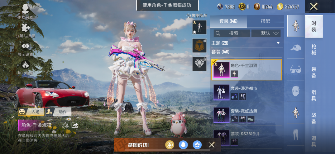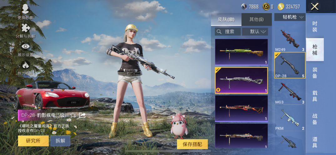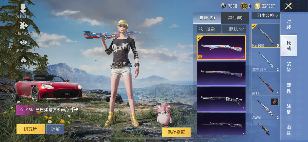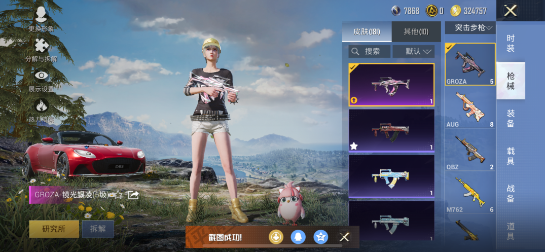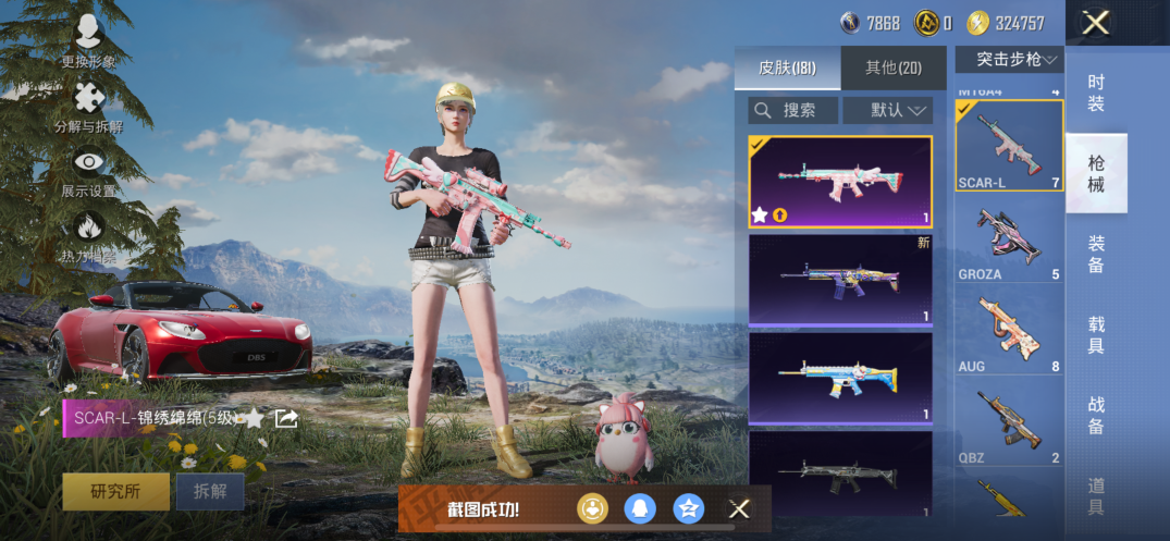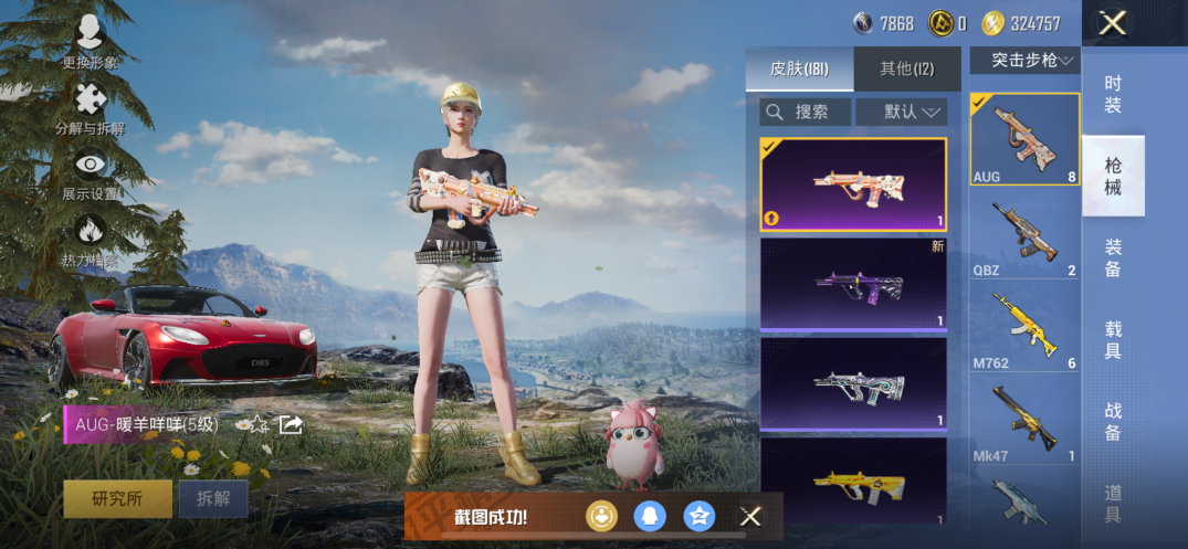 【素材号1载具2粉装7特效枪 金靴子 战队服 金羽特工】苹果手Q-1载具-2粉装-7特效枪-146套装-181枪皮-10王牌印记-坚韧铂金Ⅰ-55428热力值【1载具】阿斯顿·马丁DBS(红)【2粉装】角色-千金淑猫,黄族统领【7特效枪】SCAR-L-锦绣绵绵[5级],AUG-暖羊咩咩[5级],GROZA-镜光银凌[5级],M416-电玩时刻[5级],DP-28-豹影疾电[5级],Kar98K-巳