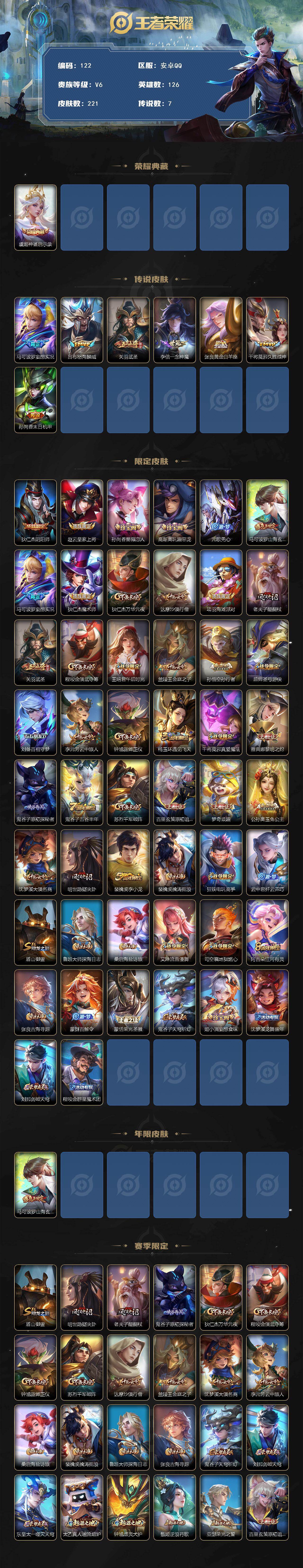 WLWZ976【v6 传说7 典藏1 星元2】安卓Q-221皮肤-126英雄 【典藏皮肤】 神鉴启示录 【传说皮肤】 妄想实况 久胜战神 武圣 一念神魔 末日机甲 黄金白羊座 怒海麟威 【史诗皮肤】 星界战将 谧流熔炉 孙行者 地狱燃心 遇见神鹿 威尼斯狂欢 山海·玄木吟 江河有灵 幻夜行动 决胜大满贯 百解令 荣光圣徽 漠中幻影 化蝶舞 玉兔公主 顽趣 魅语 幽灵船长 功夫厨神 女仆咖啡 魅力维加斯 猫狗日记 魔术师 鹰眼统帅 圣诞恋歌 箭羽风息 真爱魔法 无限星赏官 鬼剑武藏 水晶猎龙者 修