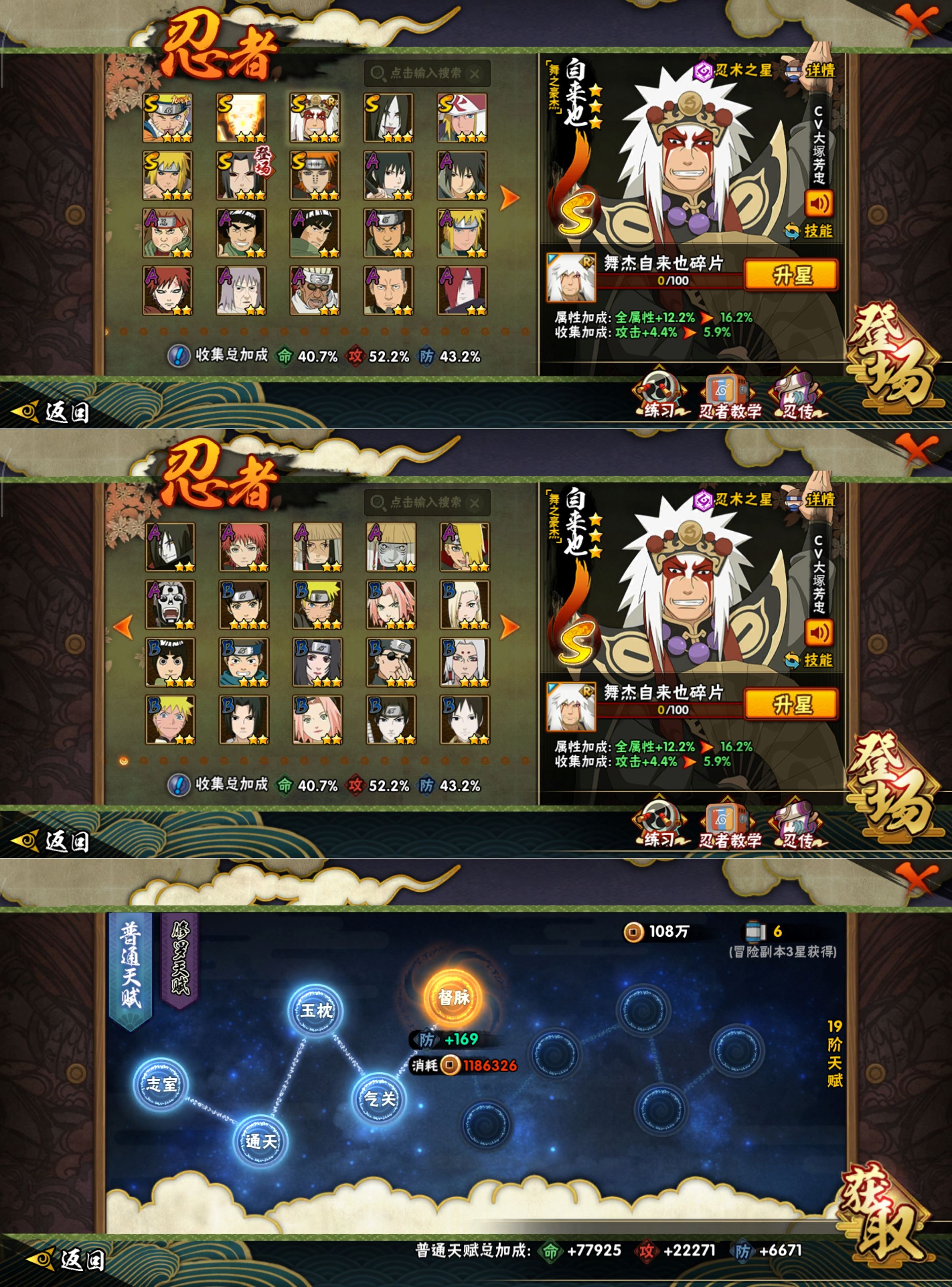 【S级】 波风水门 漩涡鸣人·宇智波佐助 大蛇丸 宇智波鼬「秽土转生」 漩涡鸣人「九喇嘛连结」 自来也「舞之豪杰」 波风水门「秽土转生」 佩恩「天道」 【A级】 波风水门「青年」 宇智波泉奈 蝎 宇智波佐助「须佐能乎」 三船「青年」 大蛇丸「晓」 猿飞阿斯玛 奇拉比 秋道丁次「忍界大战」 迪达拉 迈特凯「青春爆炸」 干柿鬼鲛 我爱罗「疾风传」 迈特凯 飞段「死司凭血」 长门「青年」 宇智波