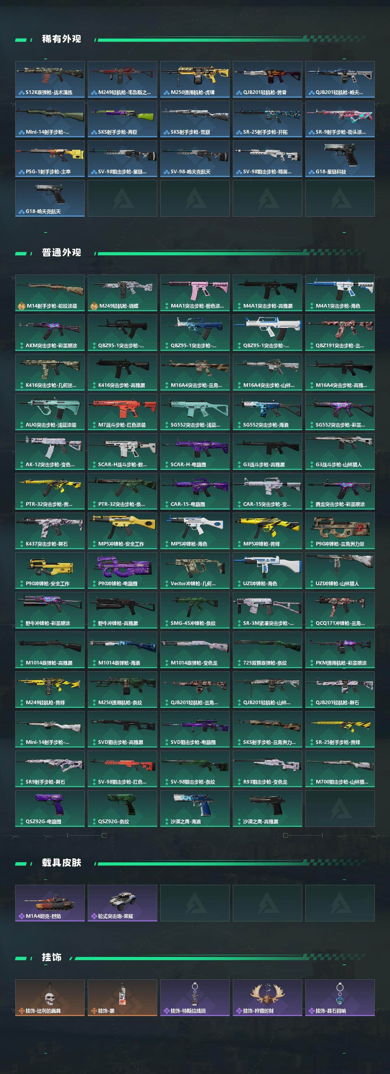 【传说外观】:M4A1突击步枪-阿米娅,ASh-12战斗步枪-鹅鸭杀,M16A4突击步枪-狩猎时刻,SG552突击步枪-运动员,AK-12突击步枪-特斯拉线圈,SCAR-H战斗