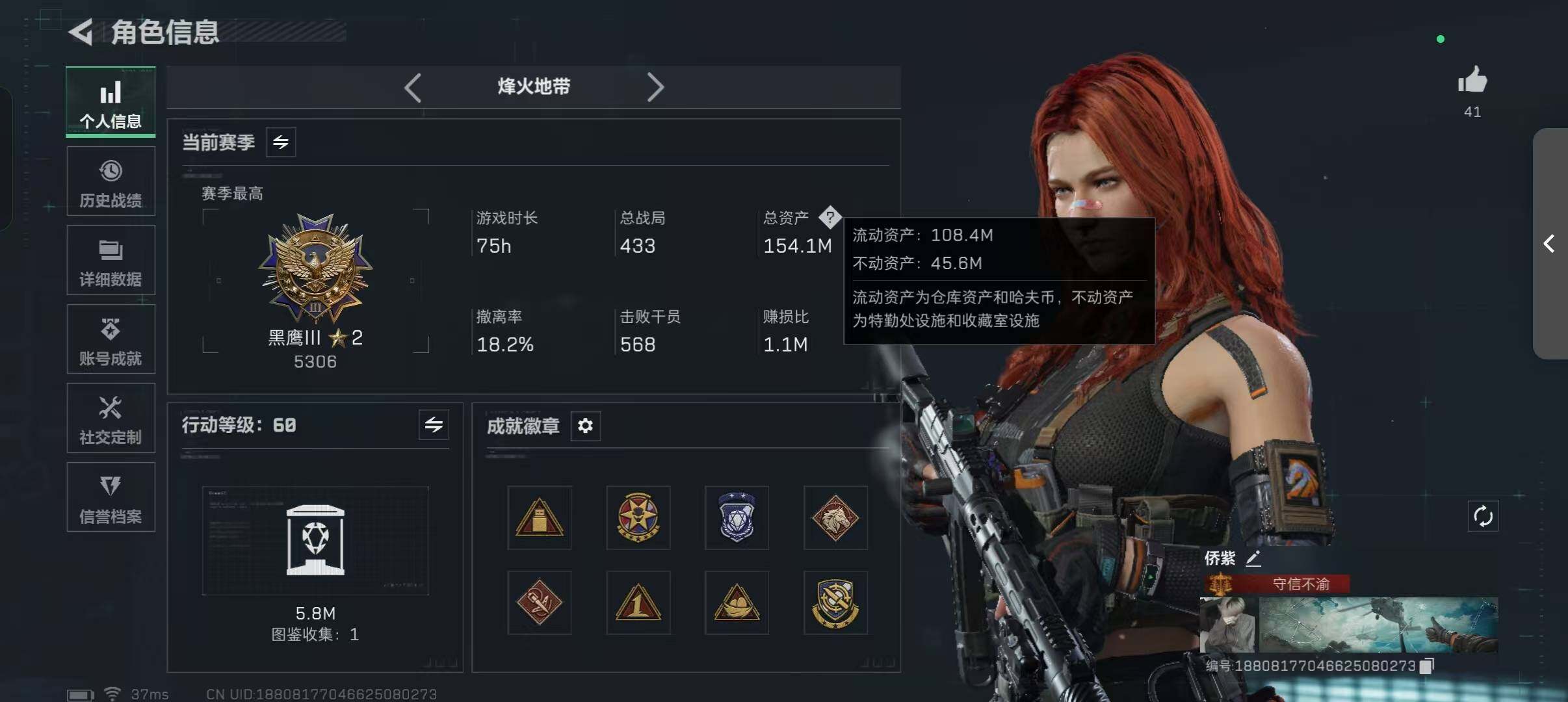 154m总资产-41684k哈伏币-60烽火等级-黑鹰-21战场等级-军士长