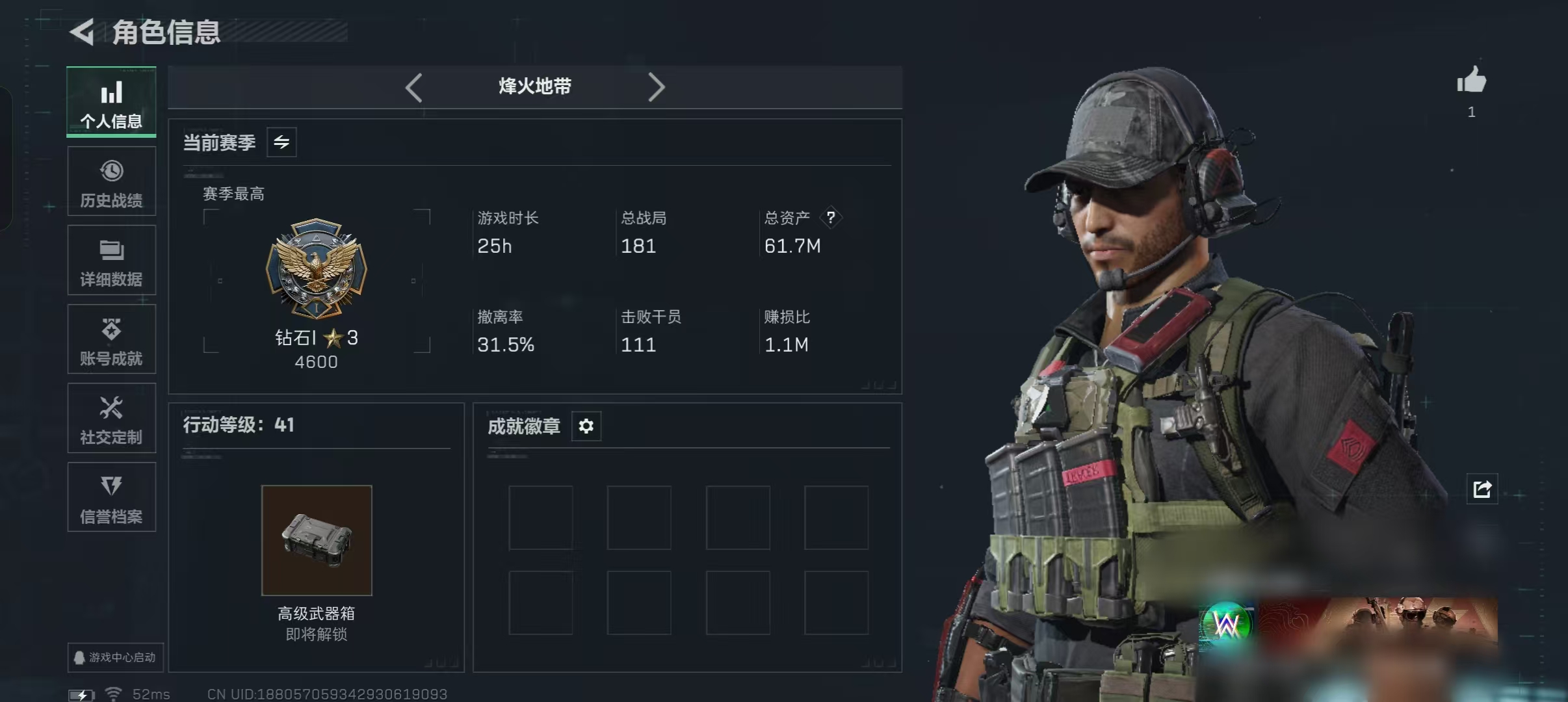 XXSJZ1876三端互通-总价值61.73M-哈夫币15,620.3-烽火地带等级41-烽火地带段位钻石【近战武器】黑鹰【枪皮】M4A1突击步枪-高雅黑 AKM突击步枪-肃杀 QBZ95-1突击步枪-高雅黑 QBZ95-1突击步枪-海浪 QBZ95-1突击步枪-2026 K437突击步枪-生存指令 MP5冲锋枪-黄蜂 MP5冲锋枪-竞技风 勇士冲锋枪-磐石 勇士冲锋枪-能天使·午夜邮差 PKM通用机枪-变色龙 M249轻机枪-黄蜂 Mini-14射手步枪-荣耀列队 M14射手步枪-工业狂潮 S