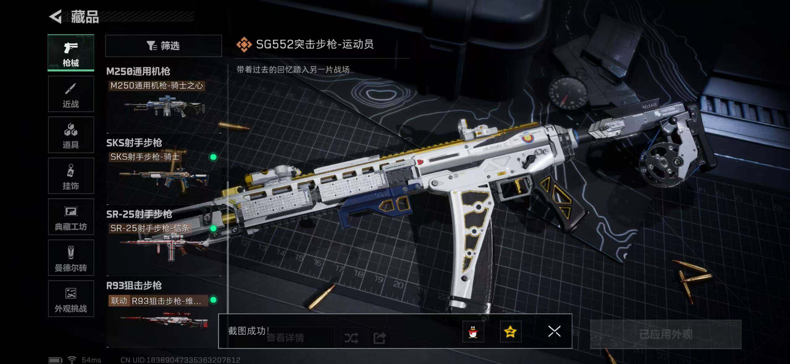 【传说外观】:SG552突击步枪-运动员,SCAR-H战斗步枪-启航,P90冲锋枪-信条,M250通用机枪-骑士之心,SR-25射手步枪-信条,R93狙击步枪-维什戴尔