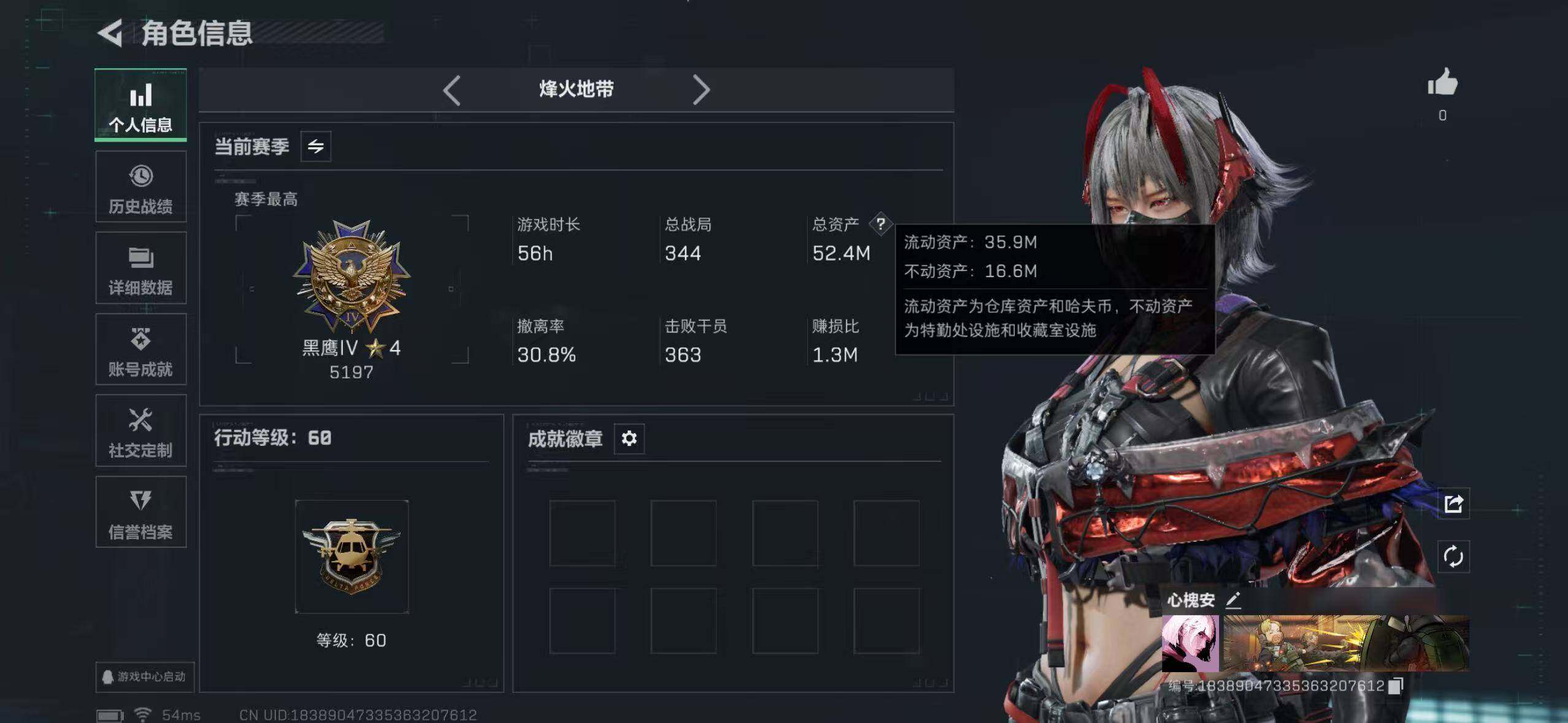 等级:60 总资产:52.4M 哈夫币:196.2W