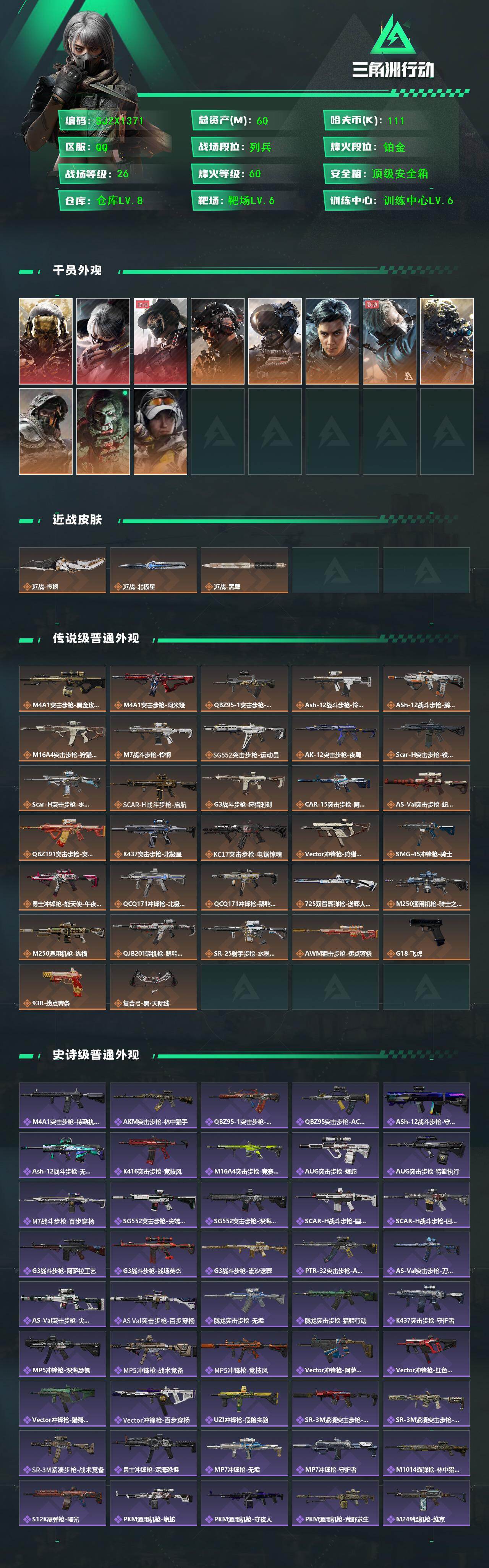 【SJZX1371】总资产(M):60M/哈夫币(K):111K/哈夫币(K):111K/传说枪皮数:32/全面战场等级:26_段位:列兵/烽火地带等级:60_段位:铂金/红狼-蚀金玫瑰/骇爪-水墨云图/露娜-黑·天际线/威龙-铁面判官/威龙-壮志凌云/威龙-飞虎/蜂医-送葬人·无题密令/无名-夜鹰/深蓝-不破誓约/红狼-电锯惊魂/露娜-金牌射手/近战-怜悯/近战-北极星/近战-黑鹰/M4A1突击步枪-蚀金玫瑰/M4A1突击步枪-阿米娅/QBZ95-1突击步枪-破军/ASh-12战斗步枪-怜悯/