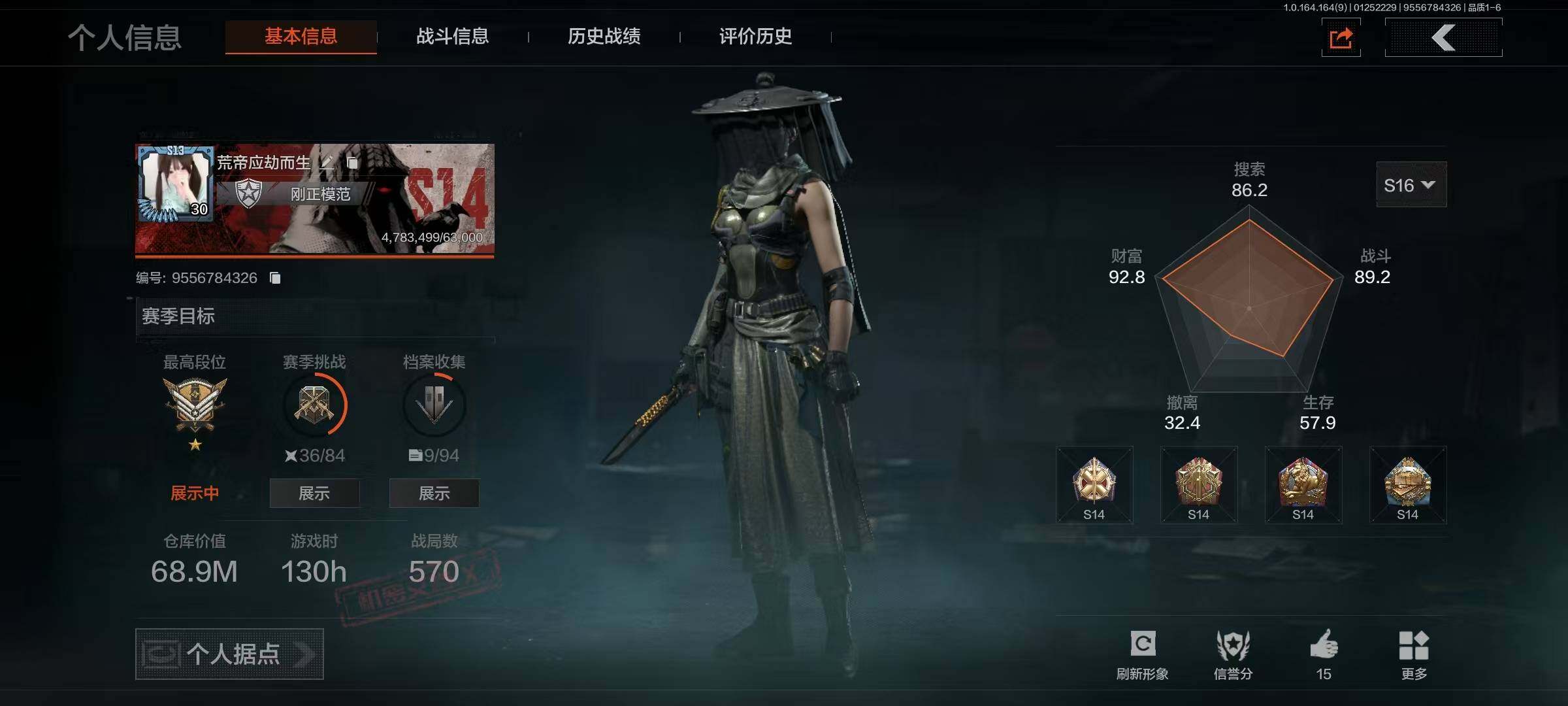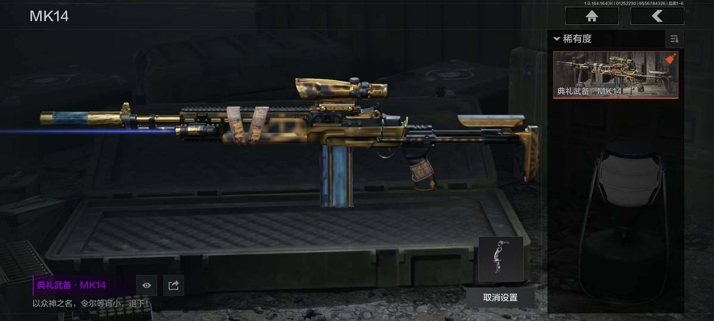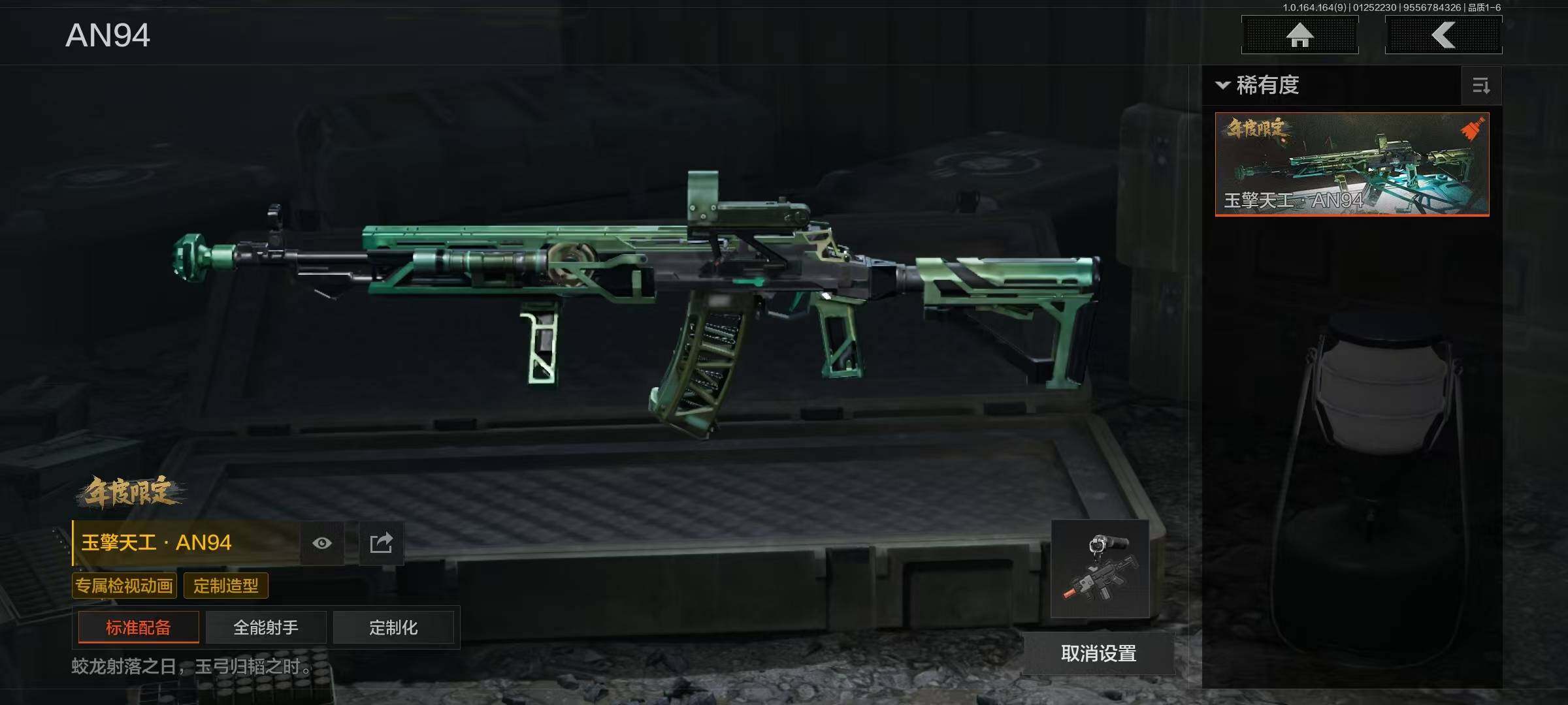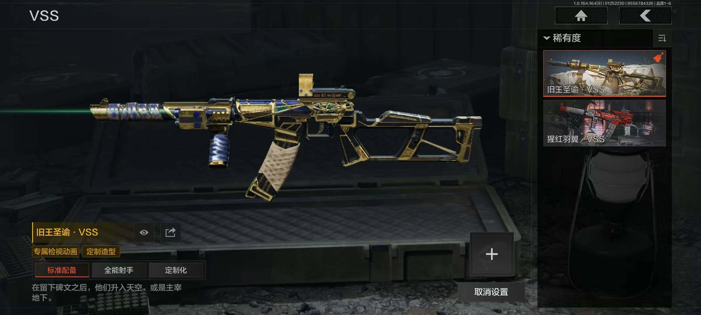【AQQH328】段位:王牌/幽燕钛玄/收割者/工兵铲/告丧夜曲AUG/告丧夜曲AR57/玉擎天工AN94/玉擎天工MP5/利齿风暴MPX/旧王圣谕VSS/清影