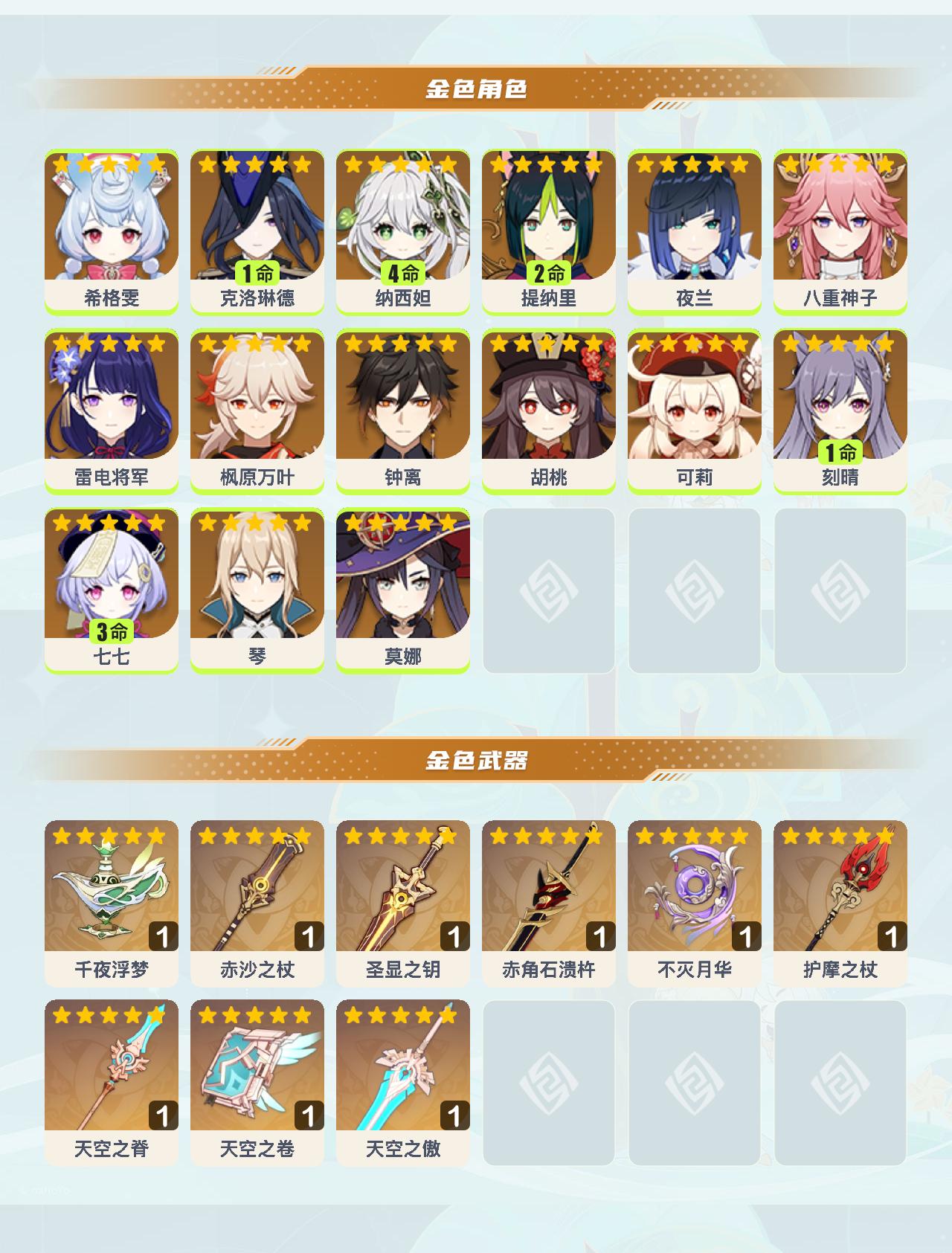 【YSYT683】60级/35黄/男主/15个五星角色/9个五星武器/4命纳西妲/可莉/雷电将军/胡桃/希格雯/钟离/枫原万叶/1命克洛琳德/八重神子/2命提纳里/夜兰/3命七七/琴/1命刻晴/莫娜/千夜浮梦/天空之卷/天空之脊/护摩之杖/赤沙之杖/赤角石溃杵/圣显之钥/不灭月华/天空之傲