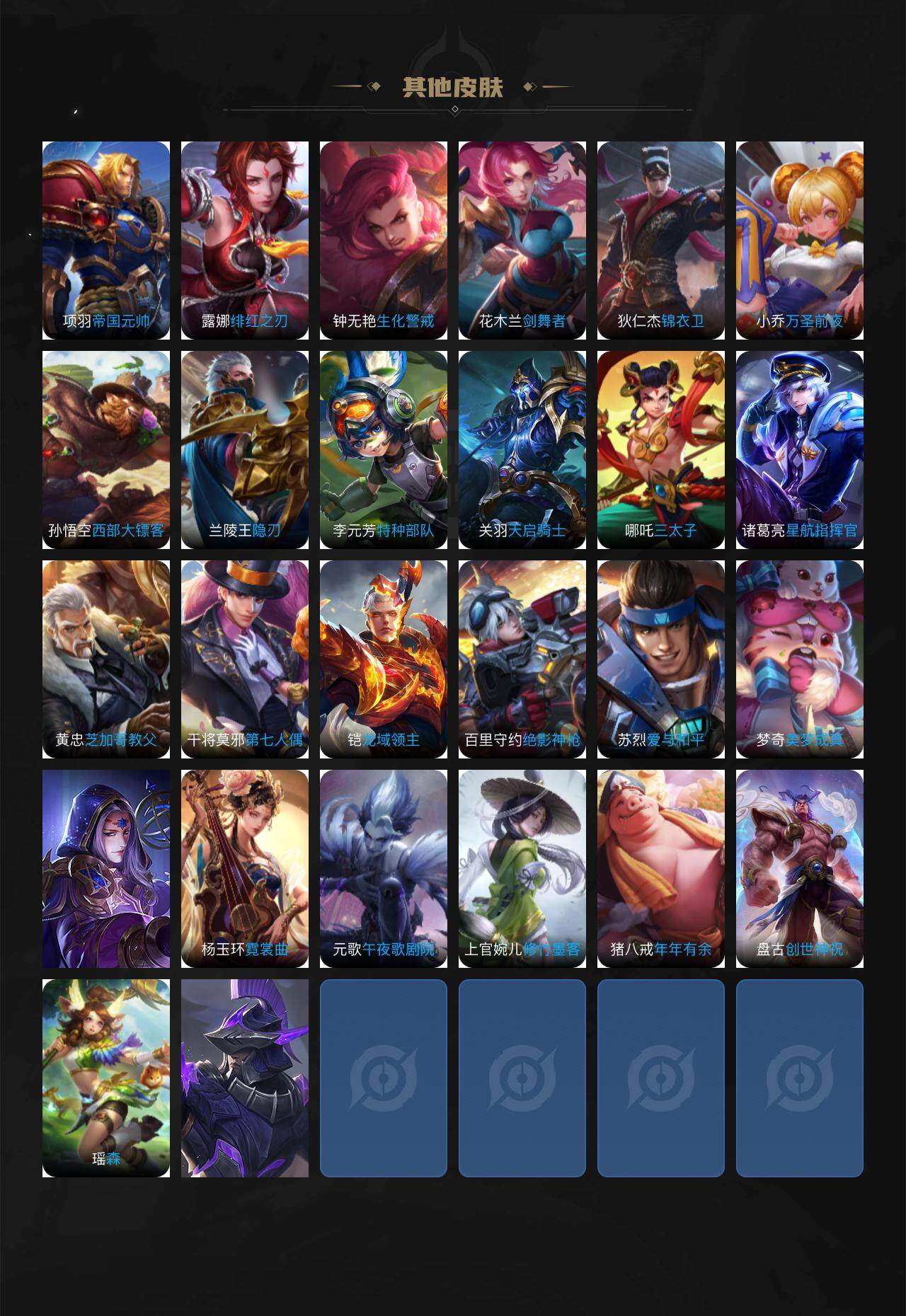 【限定皮肤】:狄仁杰阴阳师,赵云皇家上将,马可波罗暗影游猎,狄仁杰魔术师,狄仁杰万华元夜,项羽海滩派对,老夫子醍醐杖,程咬金演武夺筹,孙悟空至尊宝,孙悟空零号赤焰,钟馗驱傩正仪,鬼谷子原初探秘者,弈