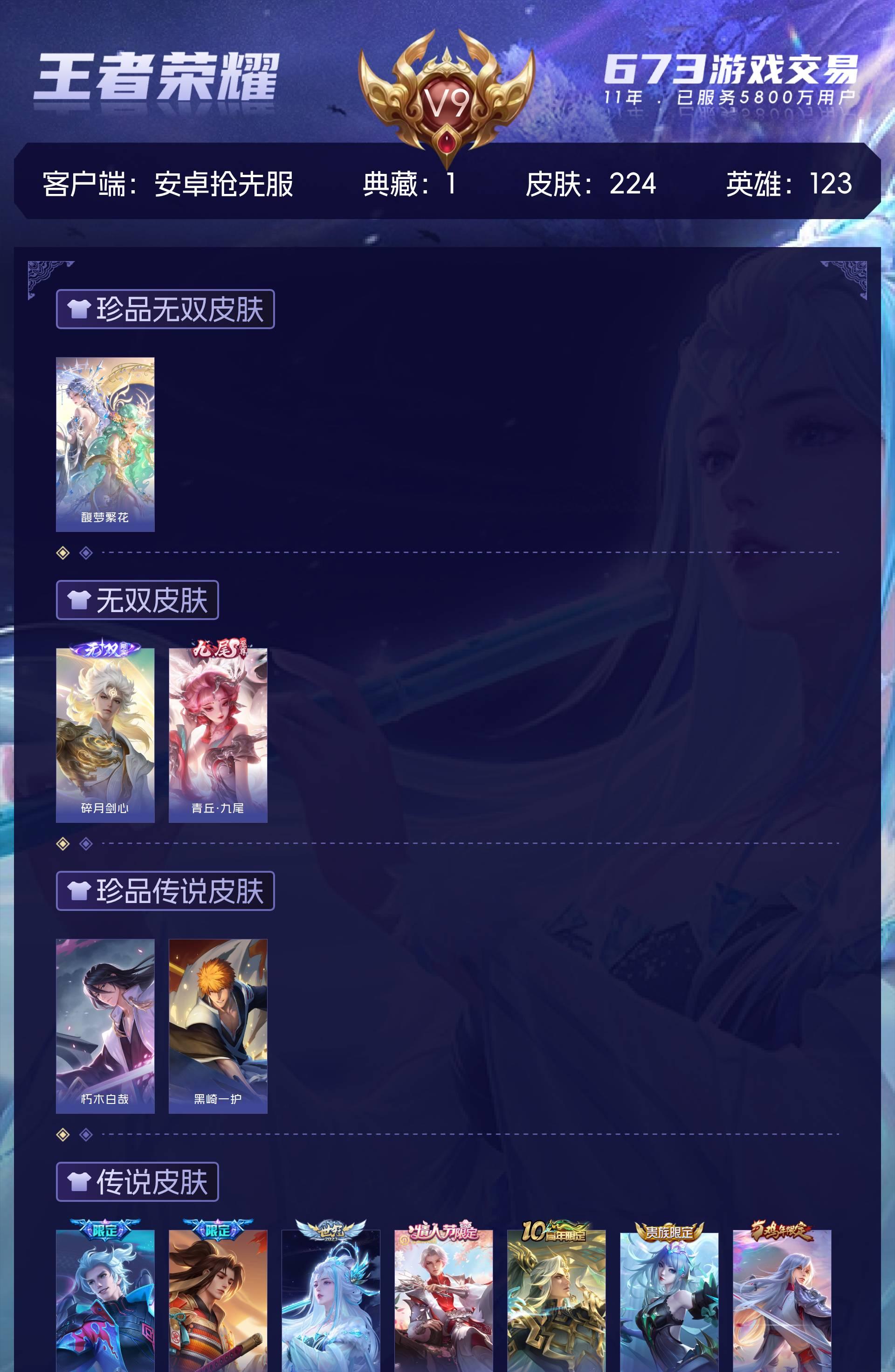 V9 皮肤224 英雄123 至尊星耀 荣耀典藏1 珍品无双1 无双皮肤2 珍品传说2 传说18 其他皮肤207