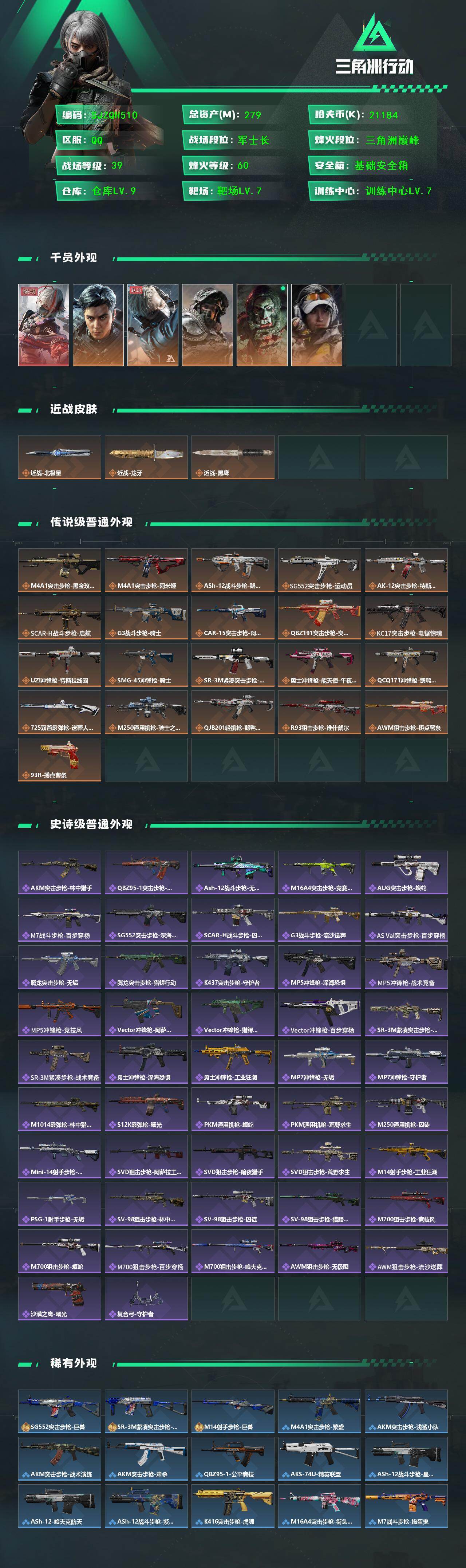 总资产(M):279M/哈夫币(K):21184K/传说枪皮数:21/全面战场等级:39_段位:军士长/烽火地带等级:60_段位:三角洲巅峰/