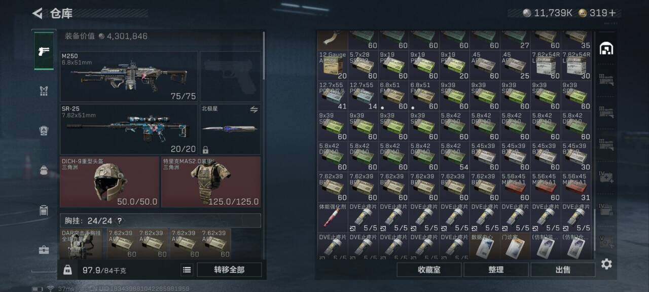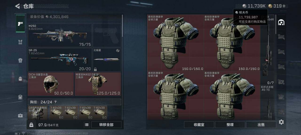总资产(M):286M/哈夫币(K):11739K/传说枪皮数:19/全面战场等级:24_段位:列兵/烽火地带等级:60_段位:黑鹰/