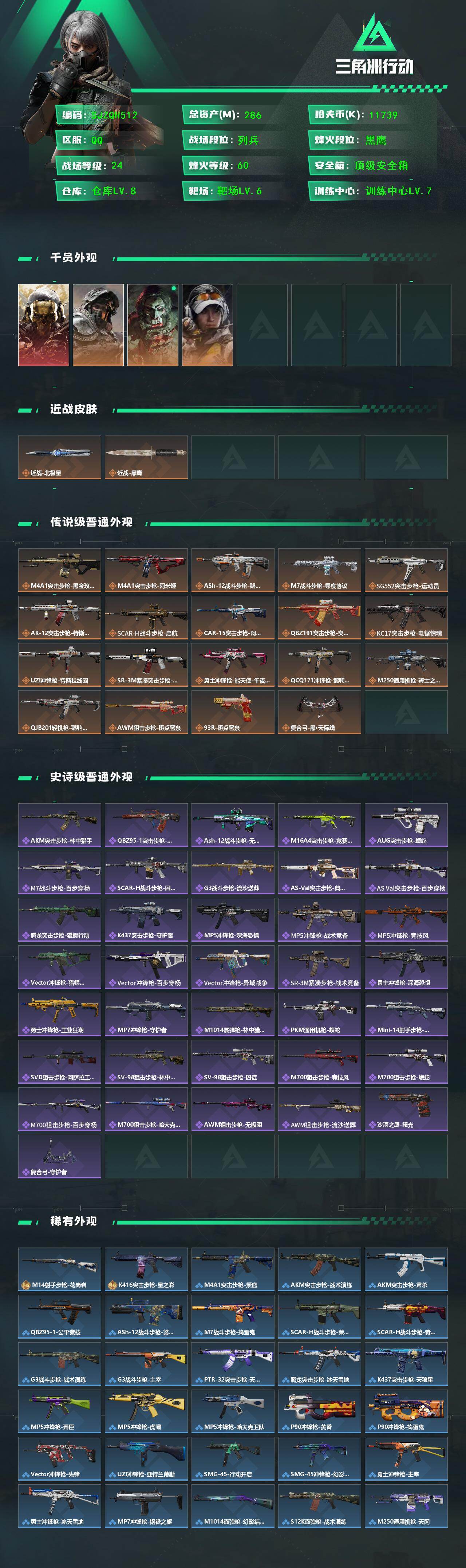 【SJZQH512】总资产(M):286M/哈夫币(K):11739K/哈夫币(K):11739K/传说枪皮数:19/全面战场等级:24_段位:列兵/烽火地带等级:60_段位:黑鹰/红狼-蚀金玫瑰/深蓝-不破誓约/红狼-电锯惊魂/露娜-金牌射手/近战-北极星/近战-黑鹰/M4A1突击步枪-蚀金玫瑰/M4A1突击步枪-阿米娅/ASh-12战斗步枪-鹅鸭杀/M7战斗步枪-零度协议/SG552突击步枪-运动员/AK-12突击步枪-特斯拉线圈/SCAR-H战斗步枪-启航/CAR-15突击步枪-阿米娅/腾