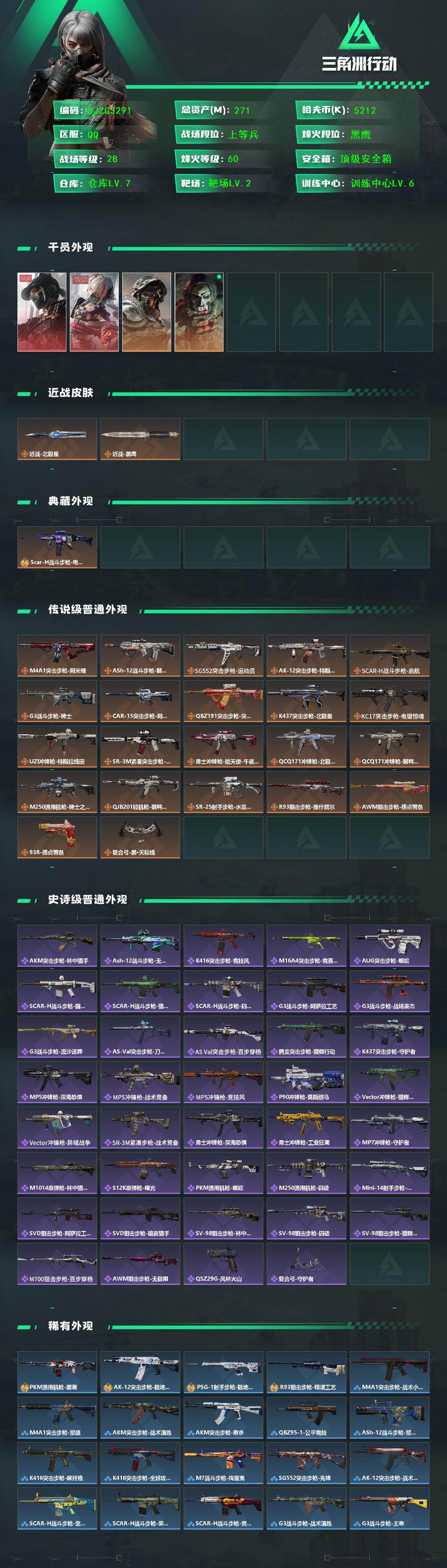 总资产(M):271M/哈夫币(K):5212K/传说枪皮数:23/全面战场等级:28_段位:上等兵/烽火地带等级:60_段位:黑鹰