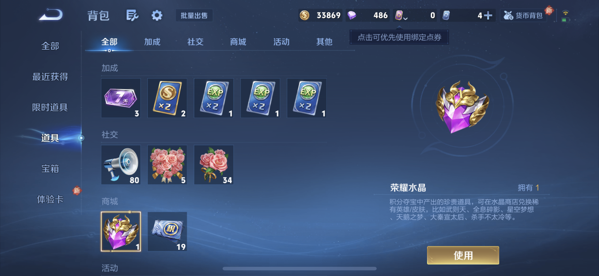 苹果q区一万战力公孙离/背包有一个荣耀水晶没使用