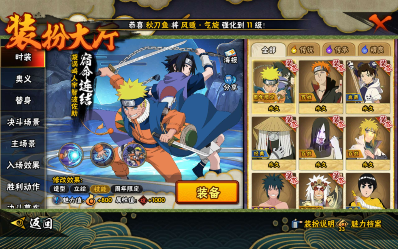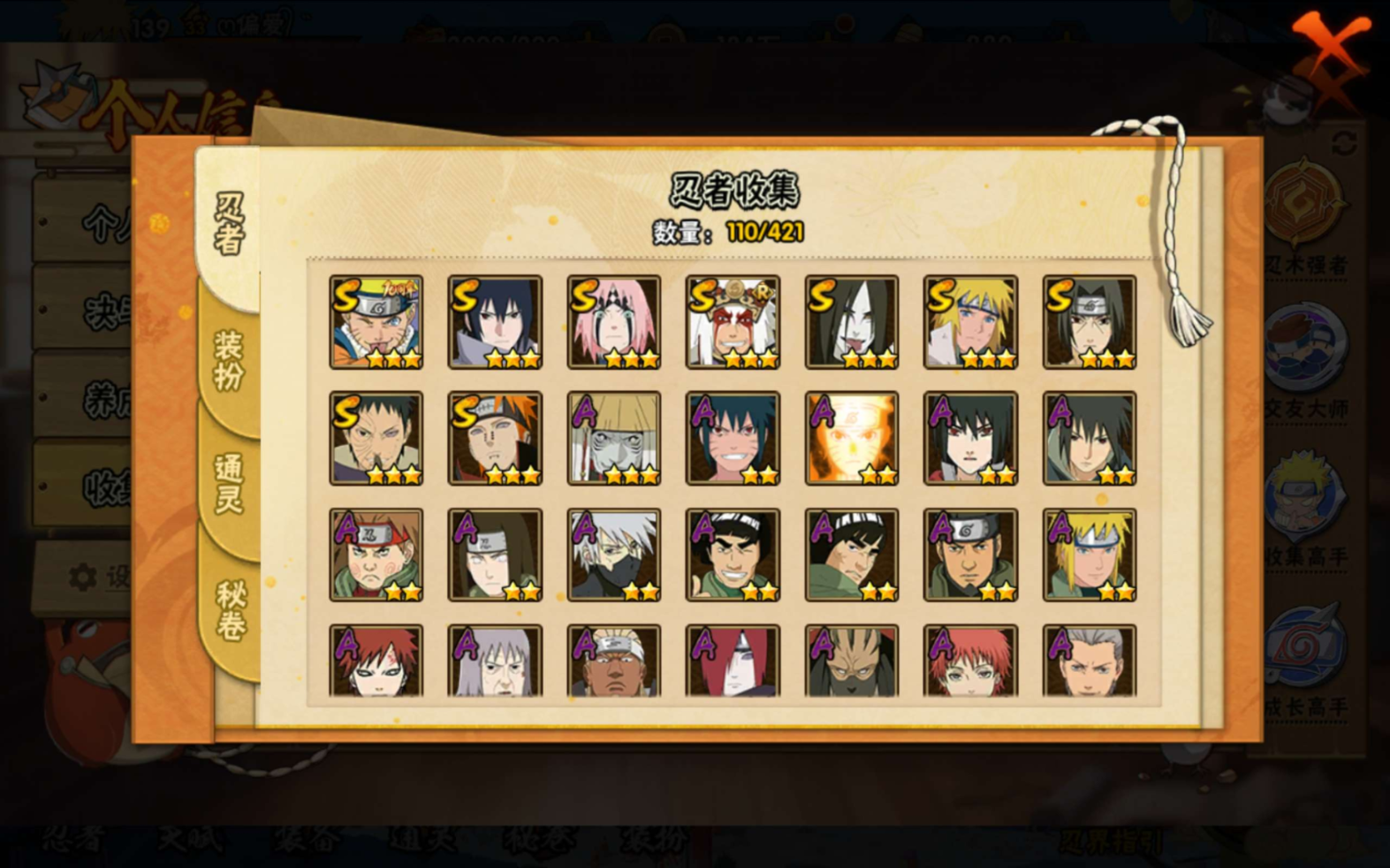 【S级忍者】宇智波带土「忍界大战」(3星),宇智波佐助「永恒万花筒」(3星),春野樱「忍界大战」(3星),自来也「舞之豪杰」(3星),宇智波鼬「须佐能乎」(3星),漩涡鸣人·宇智波佐助(3星),佩恩「天道」(3星),波风水门(3星),大蛇丸(3星),