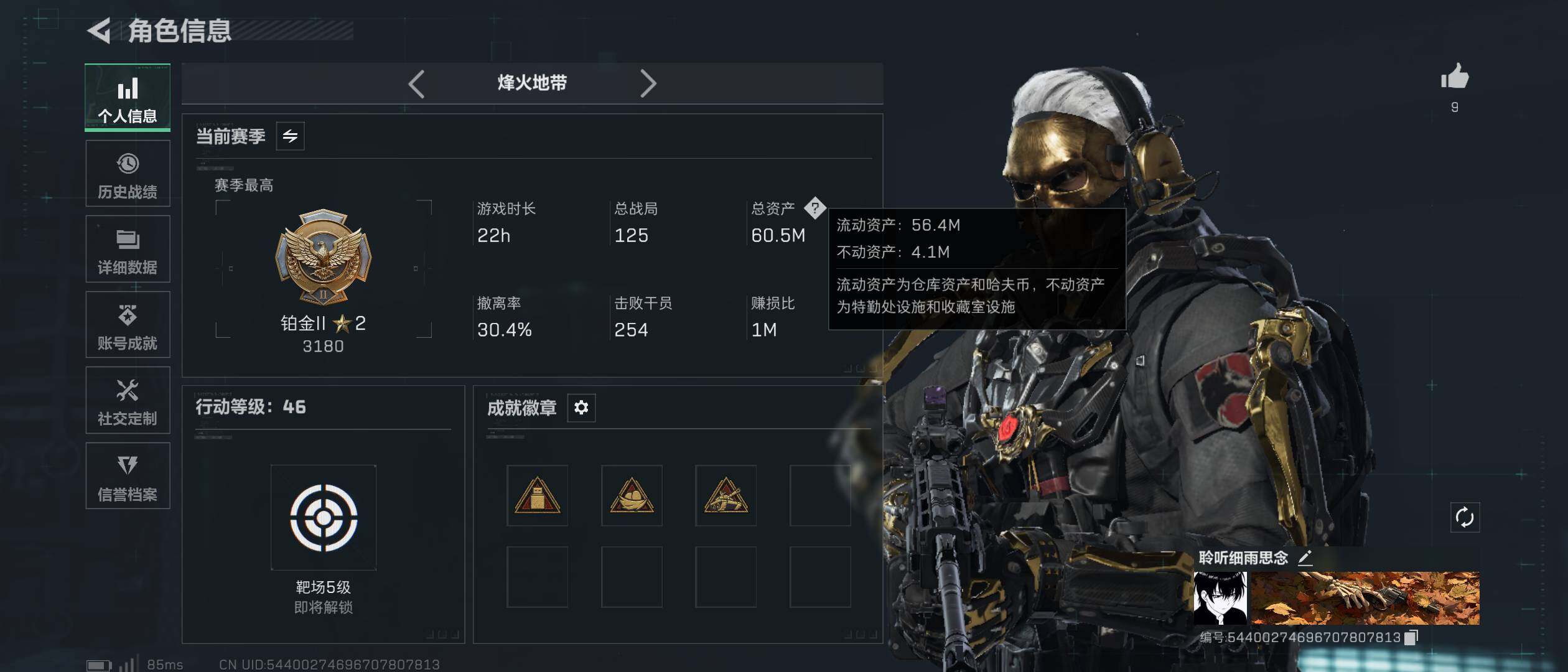 60m总资产-13187k哈伏币-46烽火等级-铂金-22战场等级-上等兵