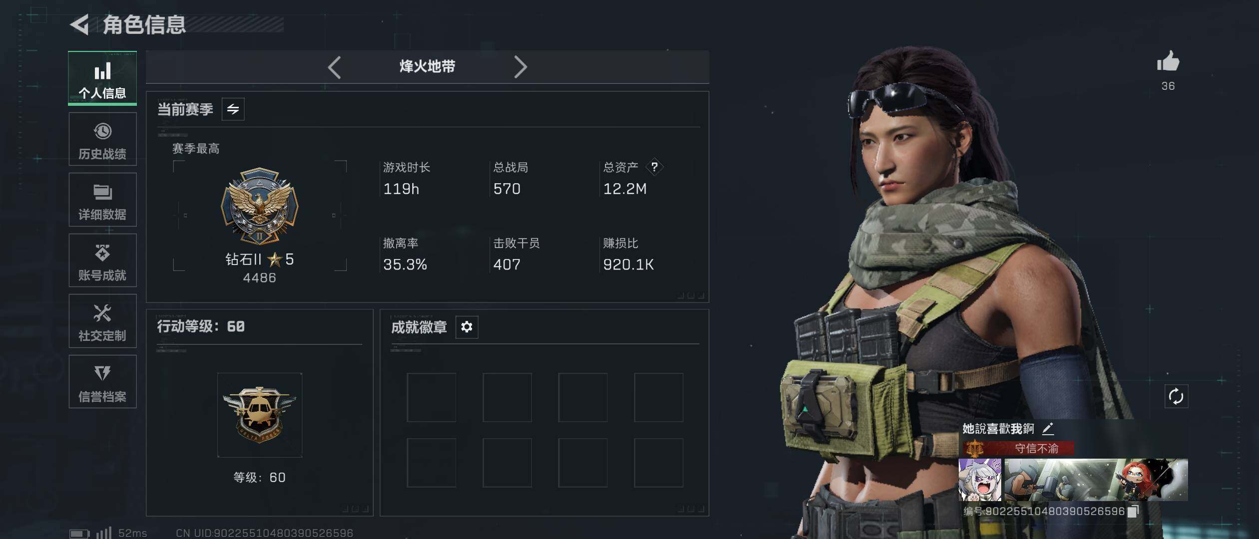 12m总资产-159k哈伏币-60烽火等级-钻石-28战场等级-列兵【干员外