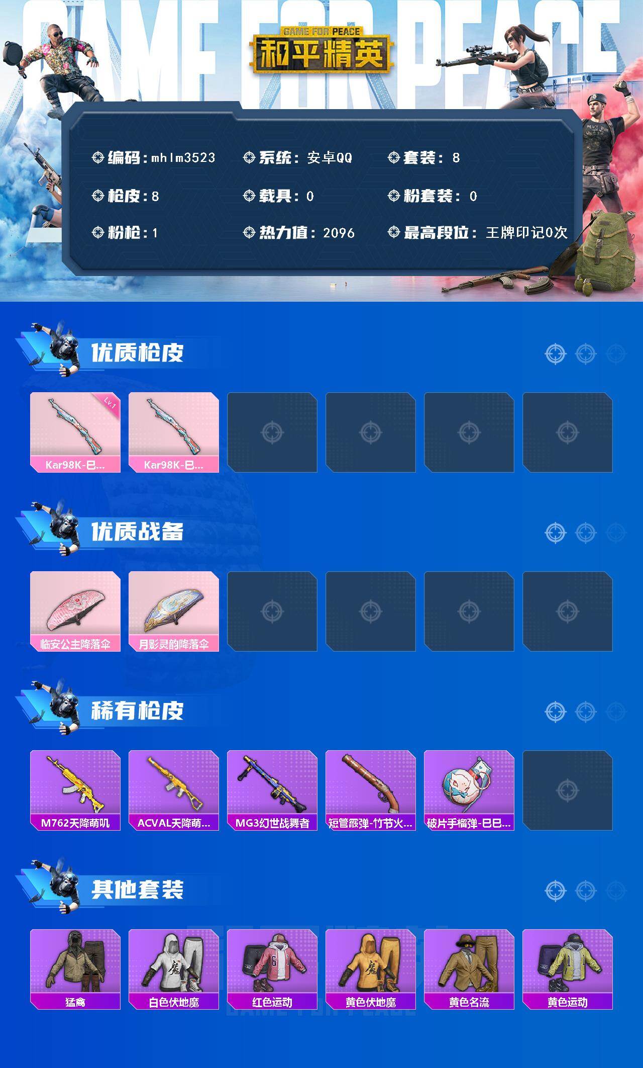 【mhlm3523】安卓 手Q-0粉装-1特效枪-0载具-0粉色飞行器-2096热力值-0王牌印记-8套装-8枪皮