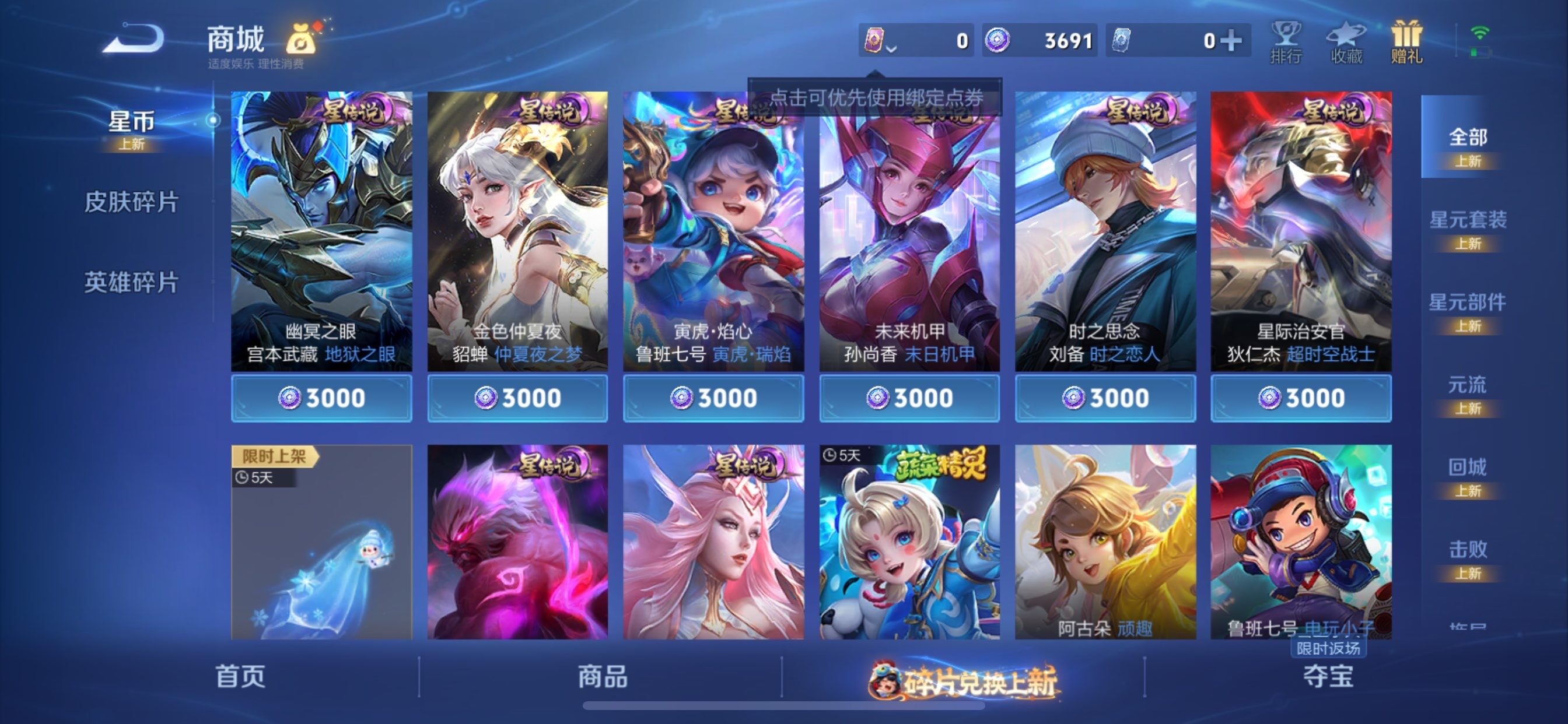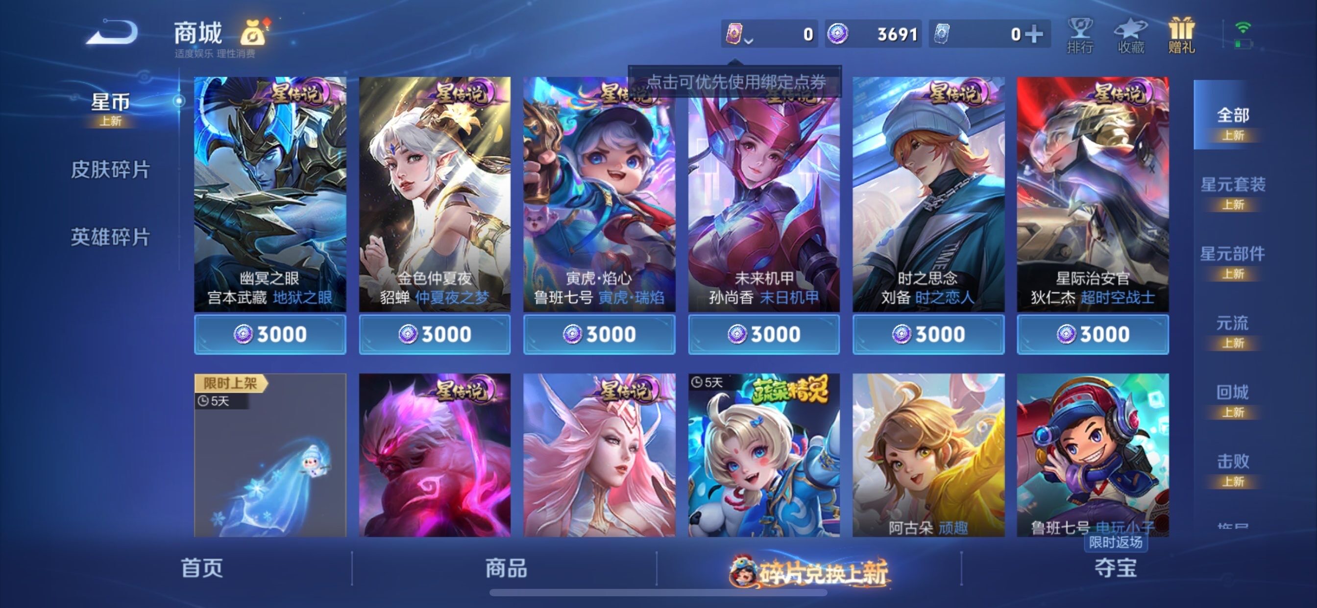 可换绑【捡漏号 白虎志 时雨天司 至尊宝】幸运值302 3691星币 3按键