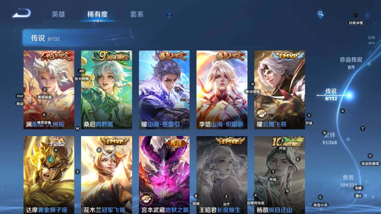 【传说皮肤】:澜愿照九州拓,桑启鸣野蒿,曜山海苍雷引,李信山海炽霜斩,曜云鹰飞将,达摩黄金狮子座,花木兰冠军飞将,宫本武藏地狱之眼