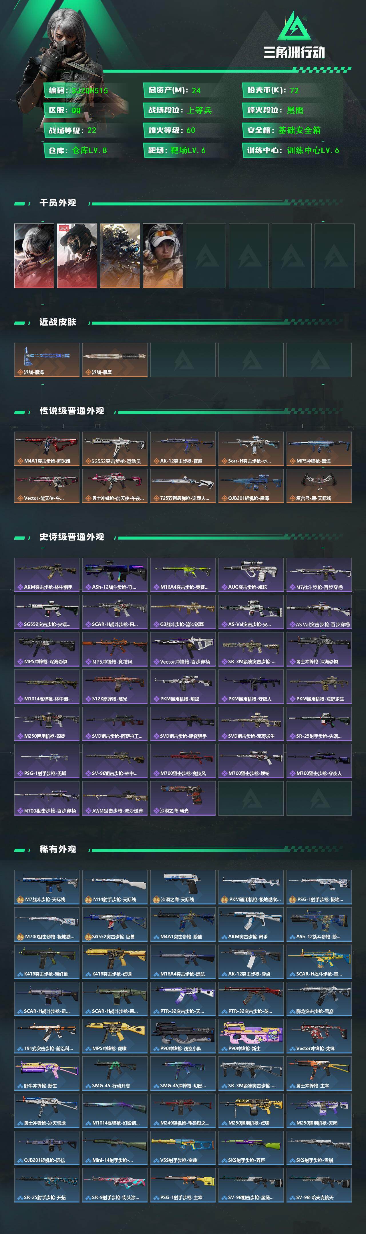 总资产(M):24M/哈夫币(K):72K/传说枪皮数:10/全面战场等级:22_段位:上等兵/烽火地带等级:60_段位:黑鹰/